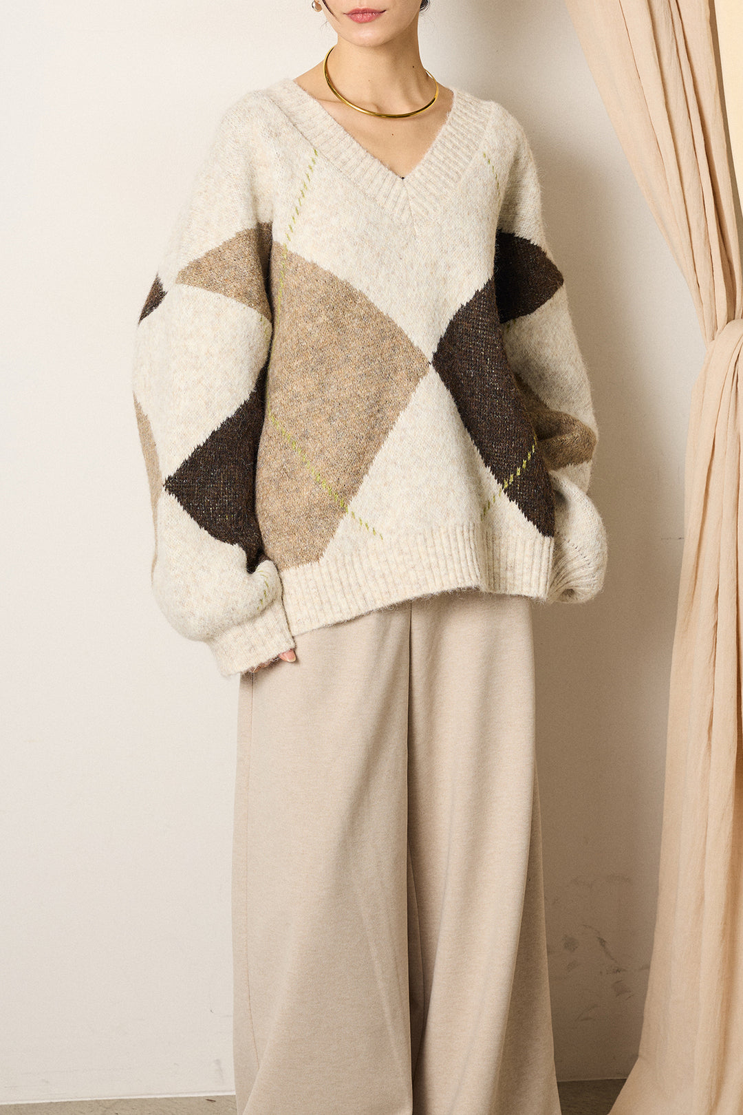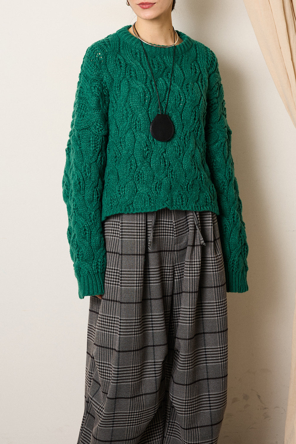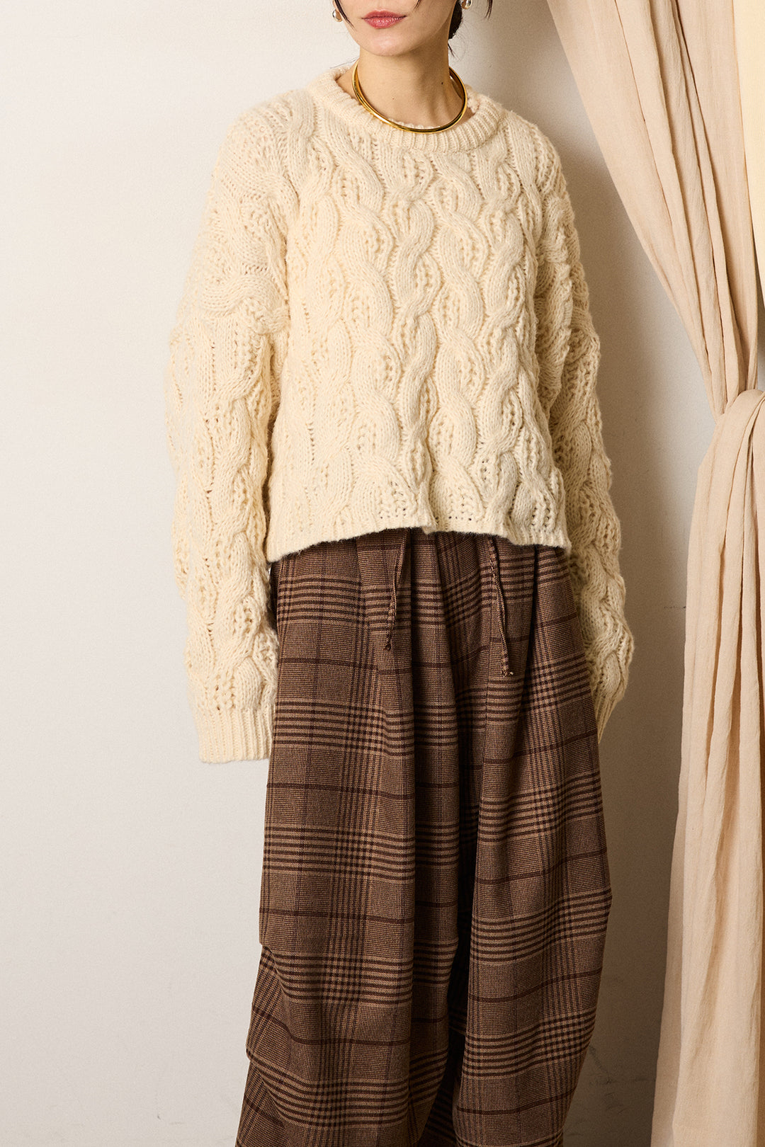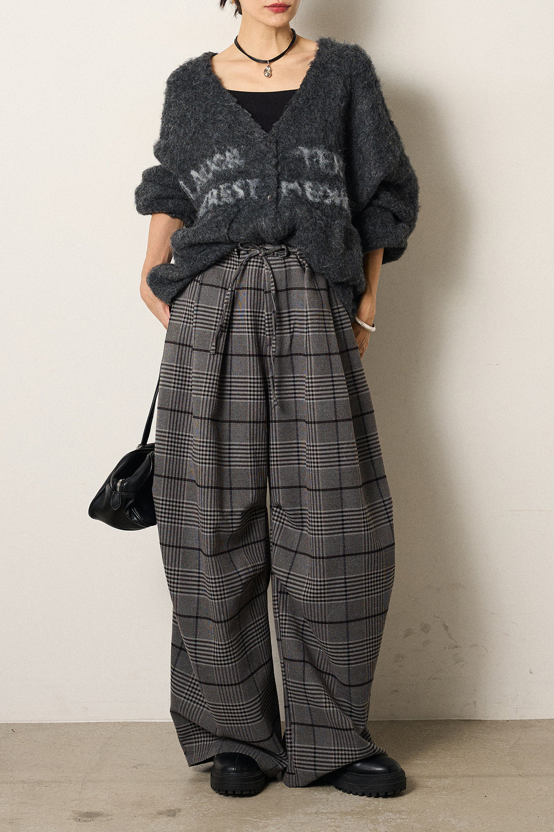 [SET]ウール混透かしロゴニットカーディガン+グレンチェックルーズタックパンツ(2set)
