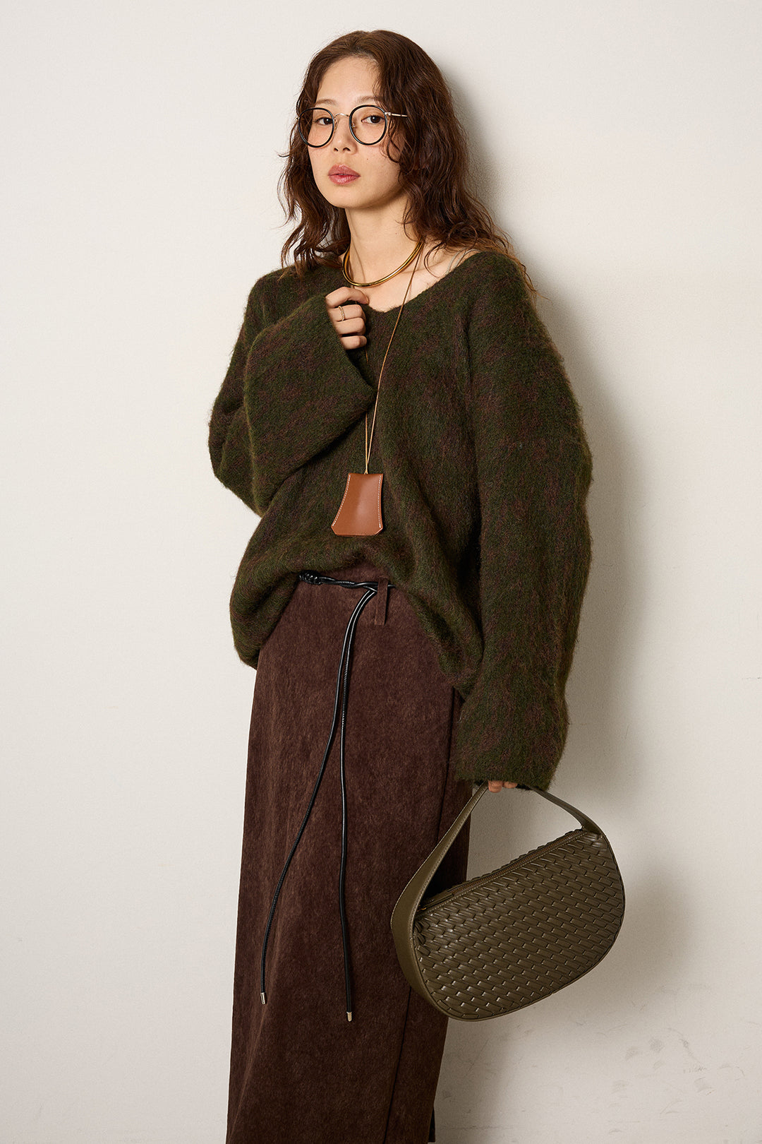 [SET]モヘアタッチマーブルニット+ロープベルト付きスウェード調スカート(2set)