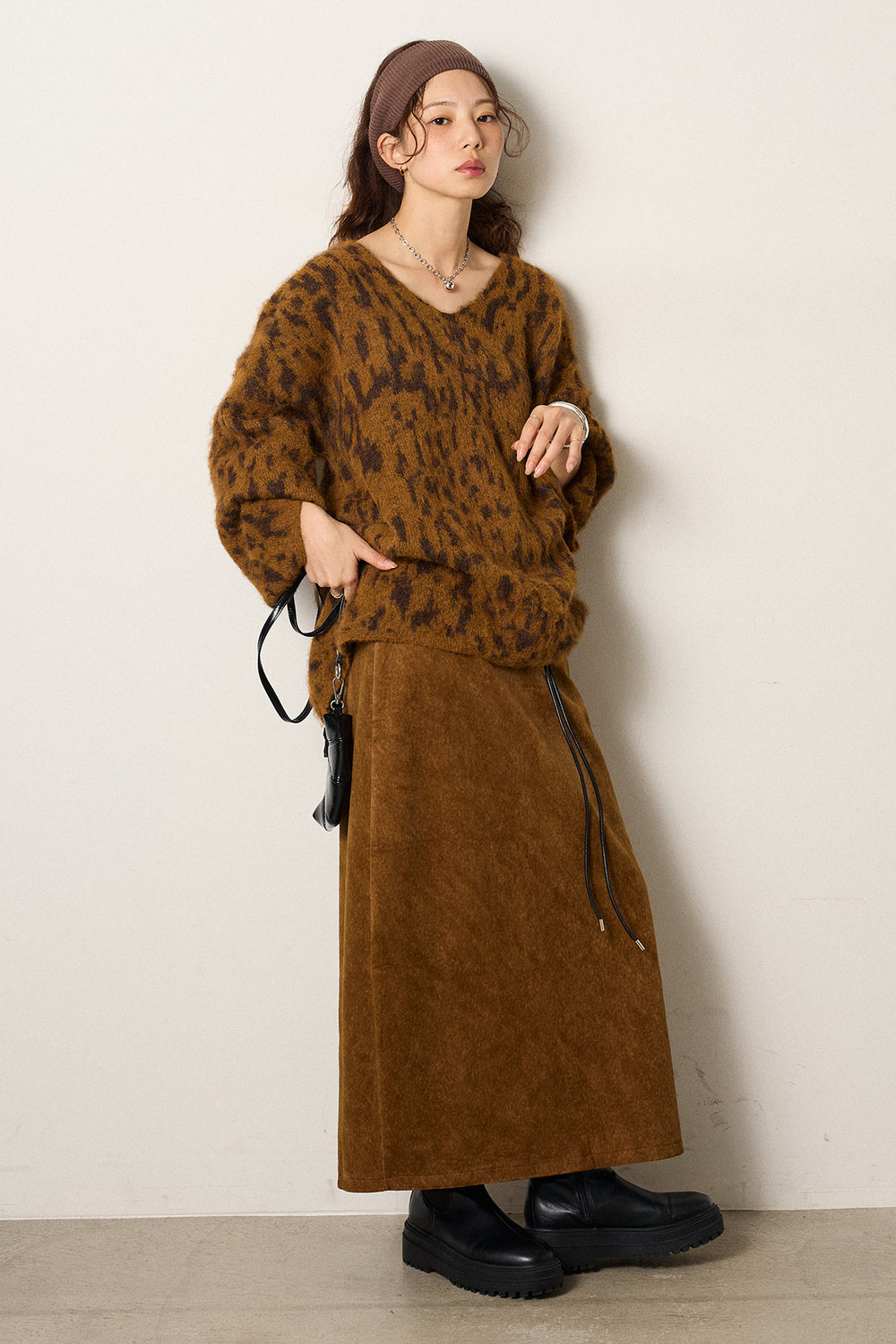 [SET]フラッフィーレオパードシャギーニット+ロープベルト付きスウェード調スカート(2set)