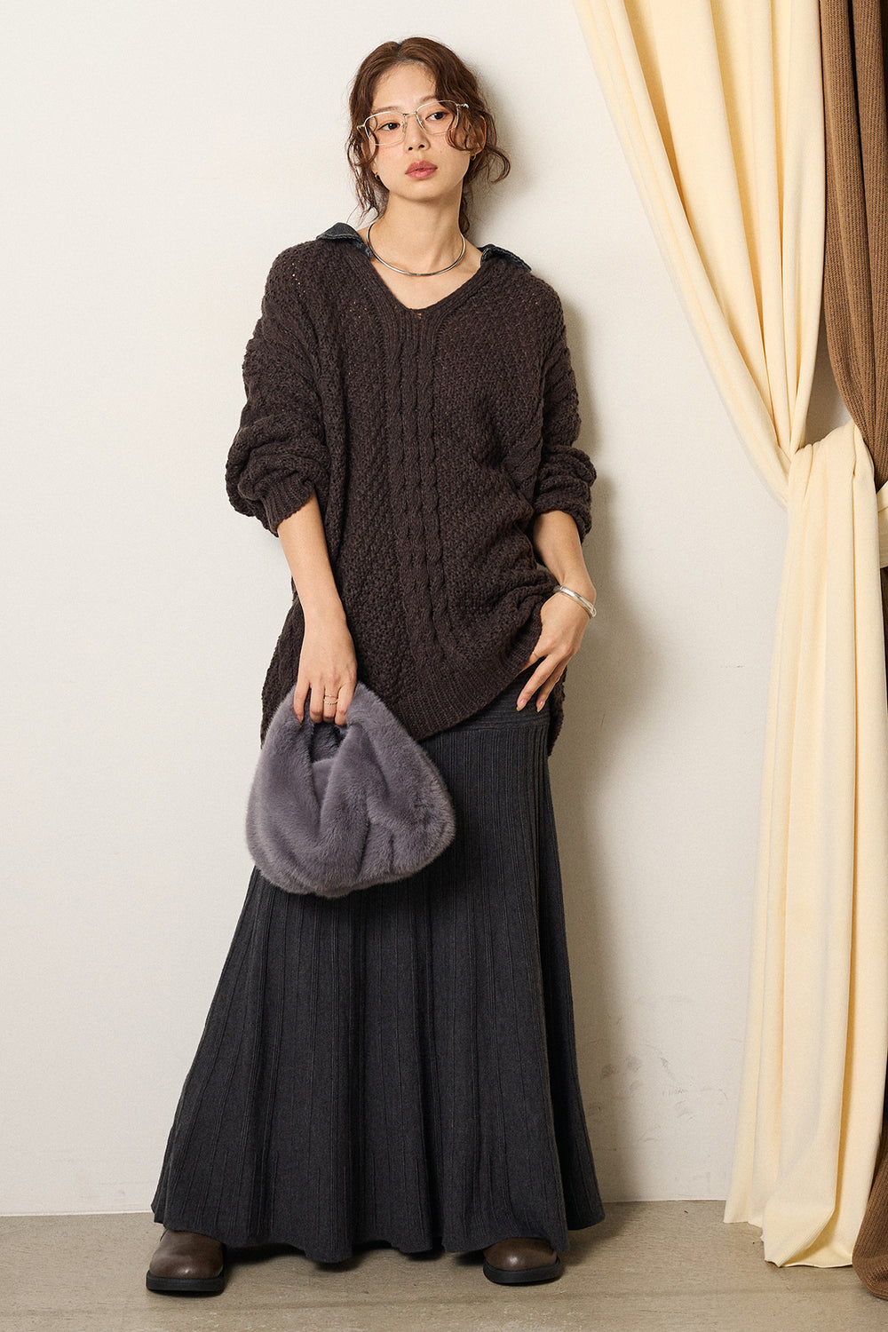 [SET]デニムカラーケーブルオーバーニット+編み地切り替えフレアニットスカート(2set)