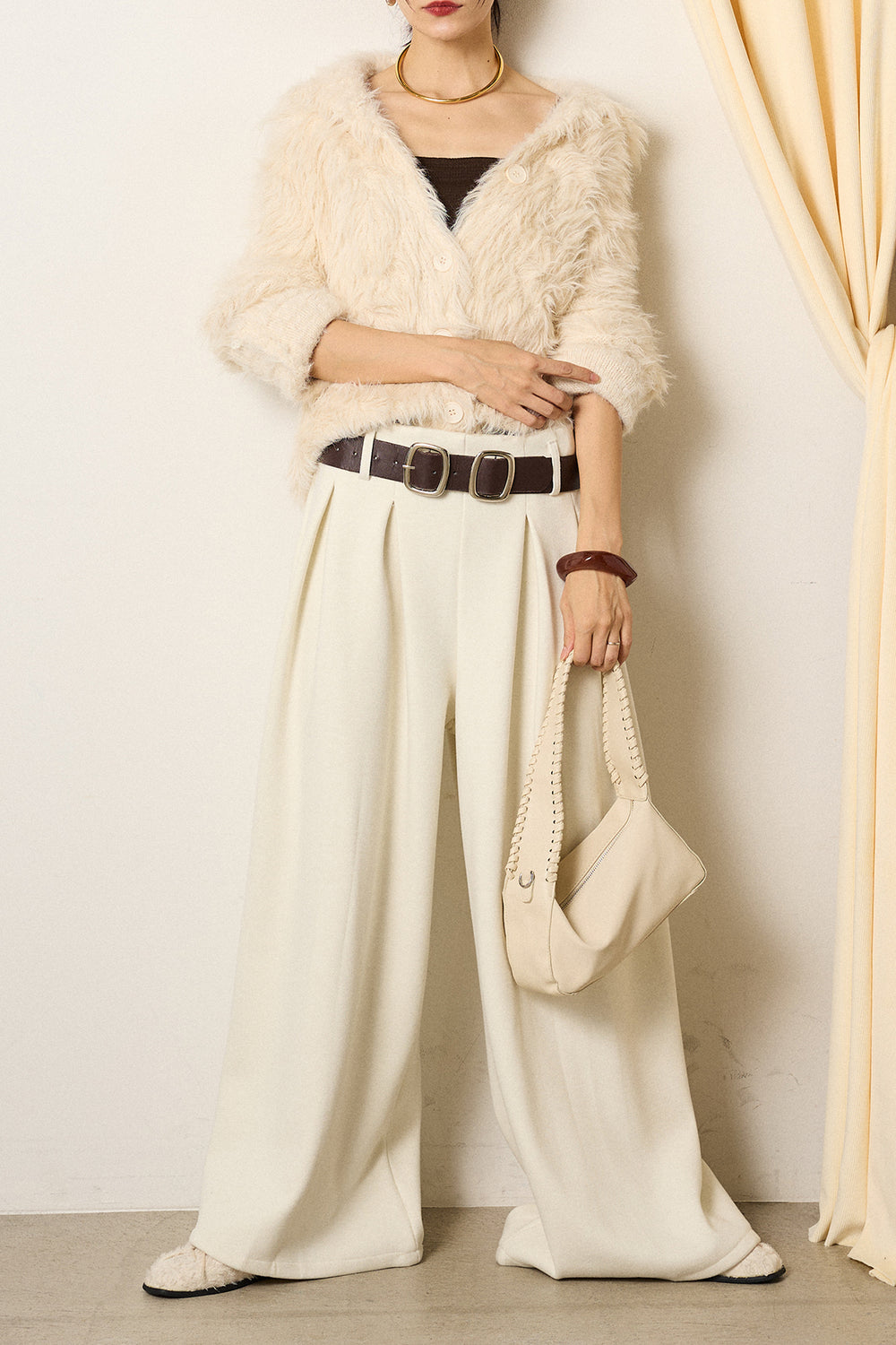 [SET]襟付きシャギーニットカーディガン+フェイクレザー太ベルト付きタックワイドパンツ(2set)