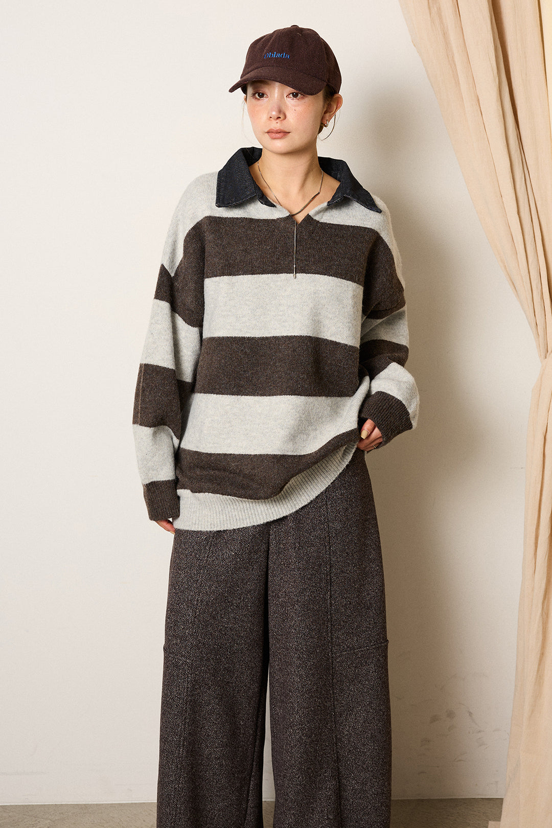 [SET]デニムカラーボーダールーズニット+ゴールドバックル太ベルト付きワイドパンツ(2set)