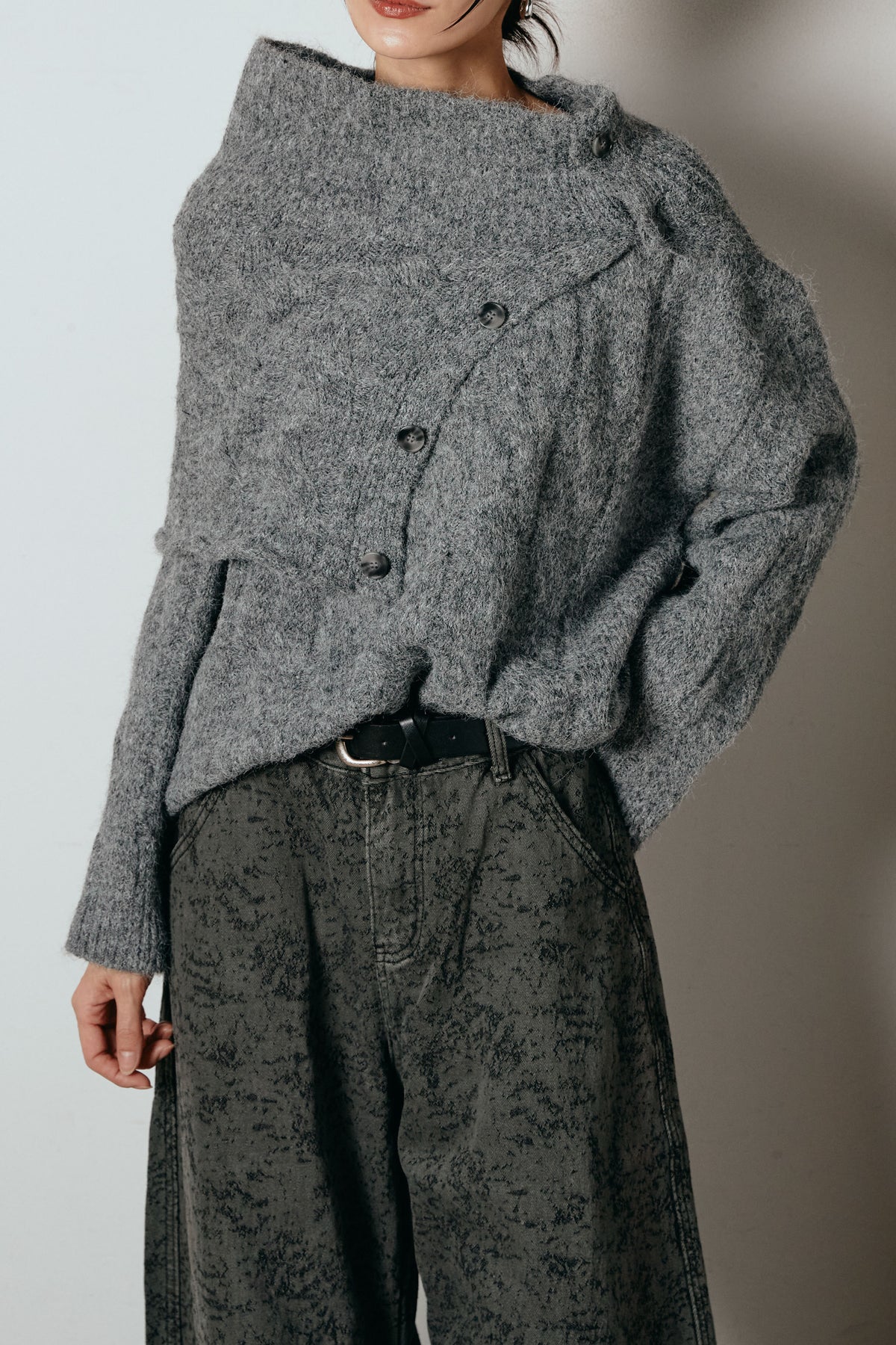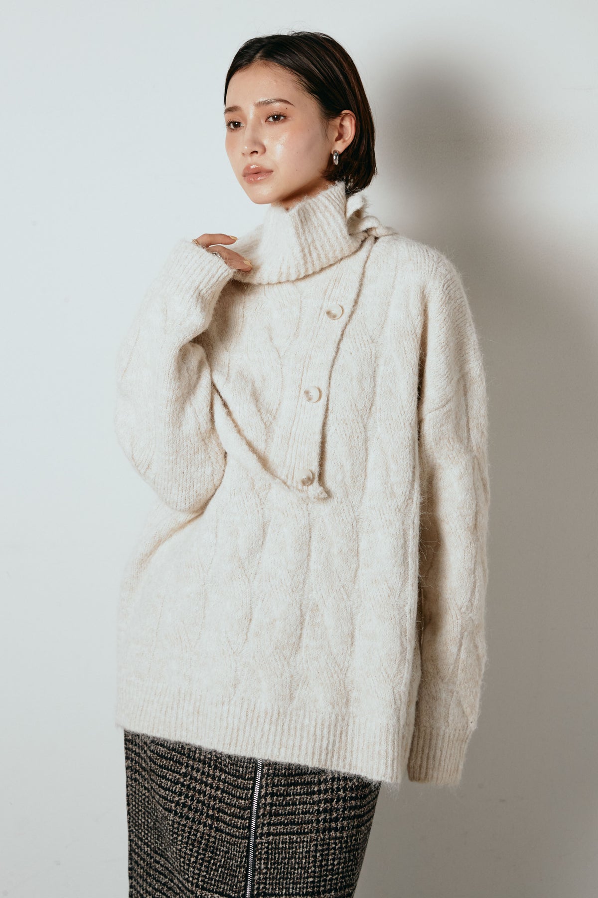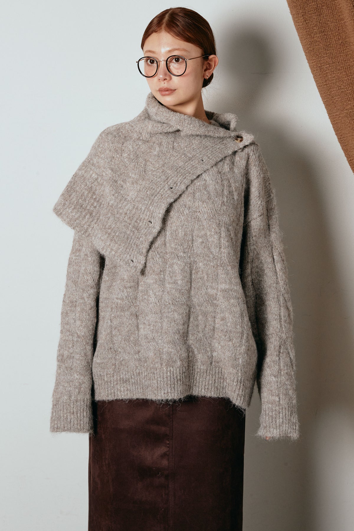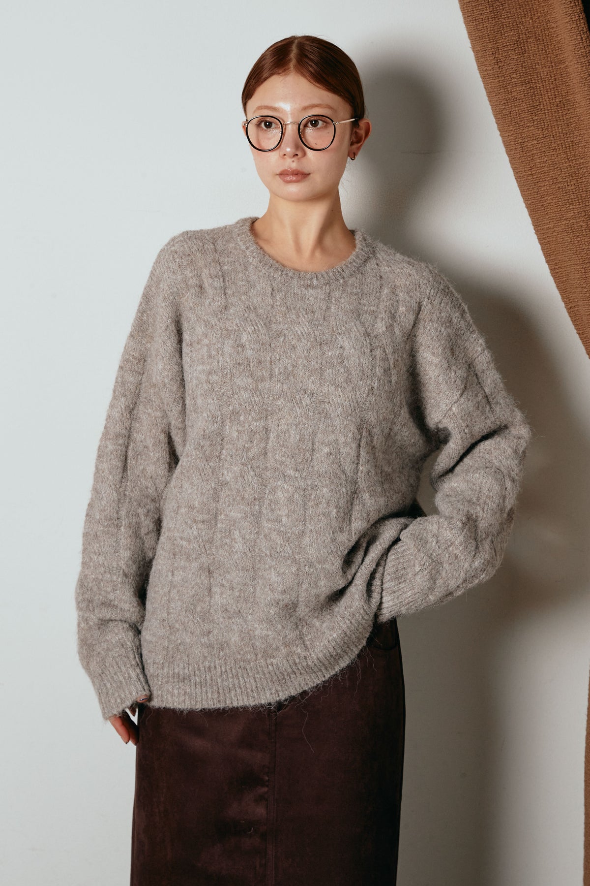 立体的なケーブル編みにケープ風のアクセントを重ねたニットトップス。首元のボタンディテールが程よい存在感を出し、ラフに着るだけでニュアンスのあるバランスに。ゆとりのあるシルエットが抜け感を生み、スカートにもパンツにも合わせやすい一枚です。優しい風合いがコーデをまろやかにまとめ、日常に取り入れやすいアイテム。