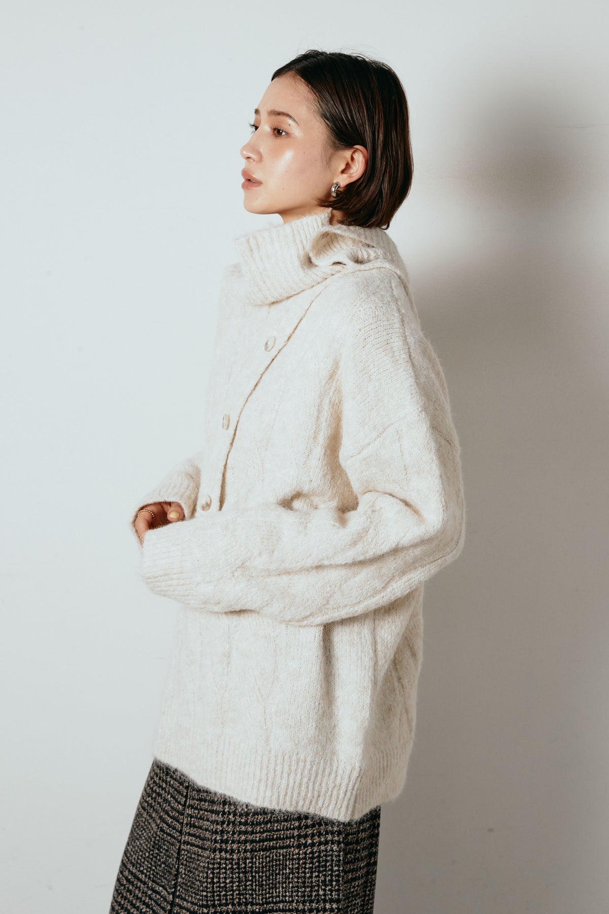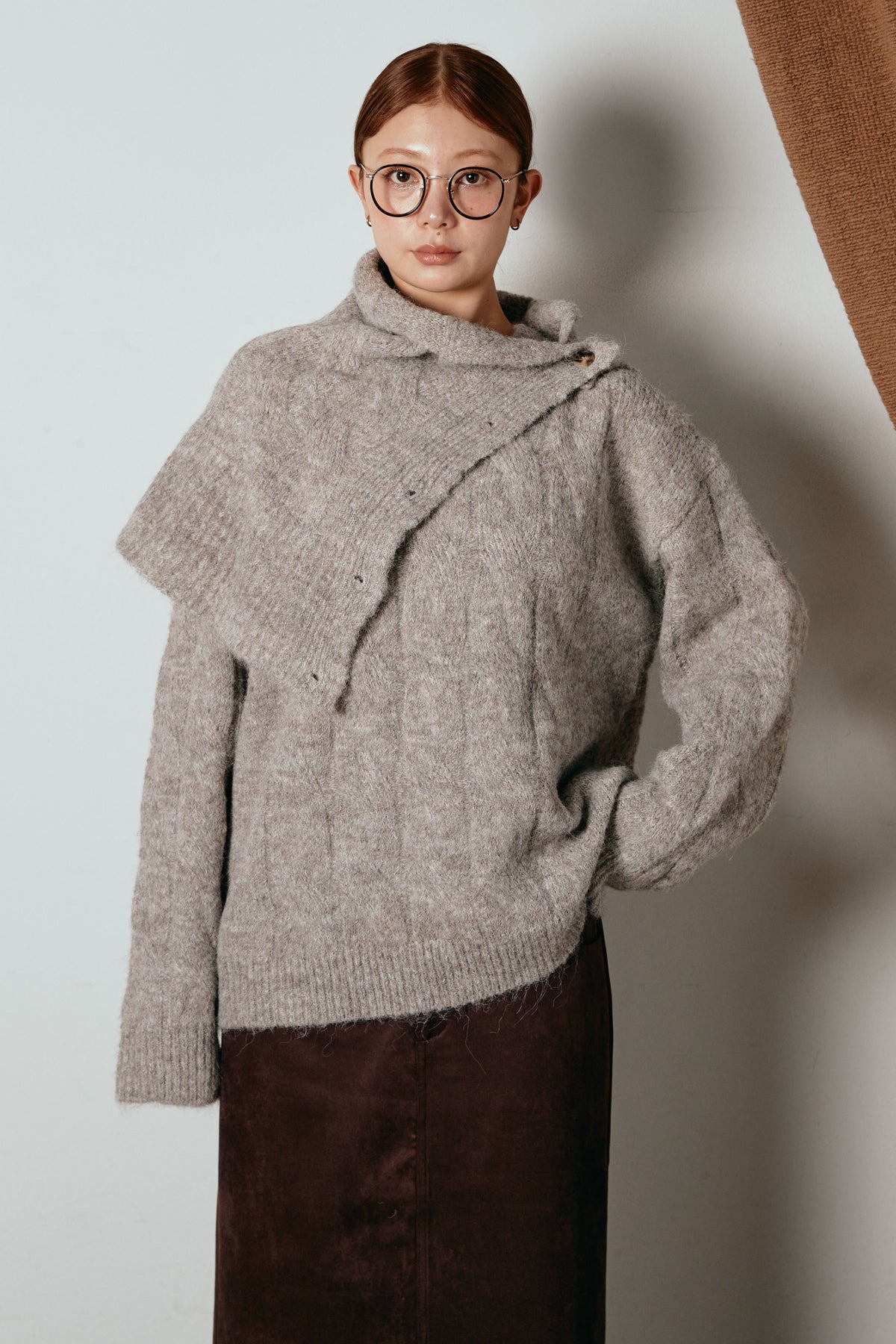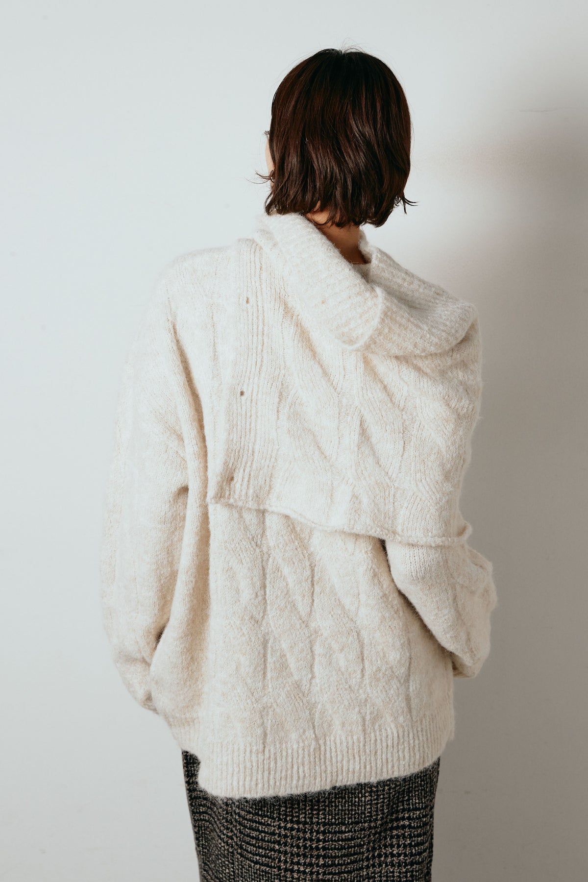 立体的なケーブル編みにケープ風のアクセントを重ねたニットトップス。首元のボタンディテールが程よい存在感を出し、ラフに着るだけでニュアンスのあるバランスに。ゆとりのあるシルエットが抜け感を生み、スカートにもパンツにも合わせやすい一枚です。優しい風合いがコーデをまろやかにまとめ、日常に取り入れやすいアイテム。