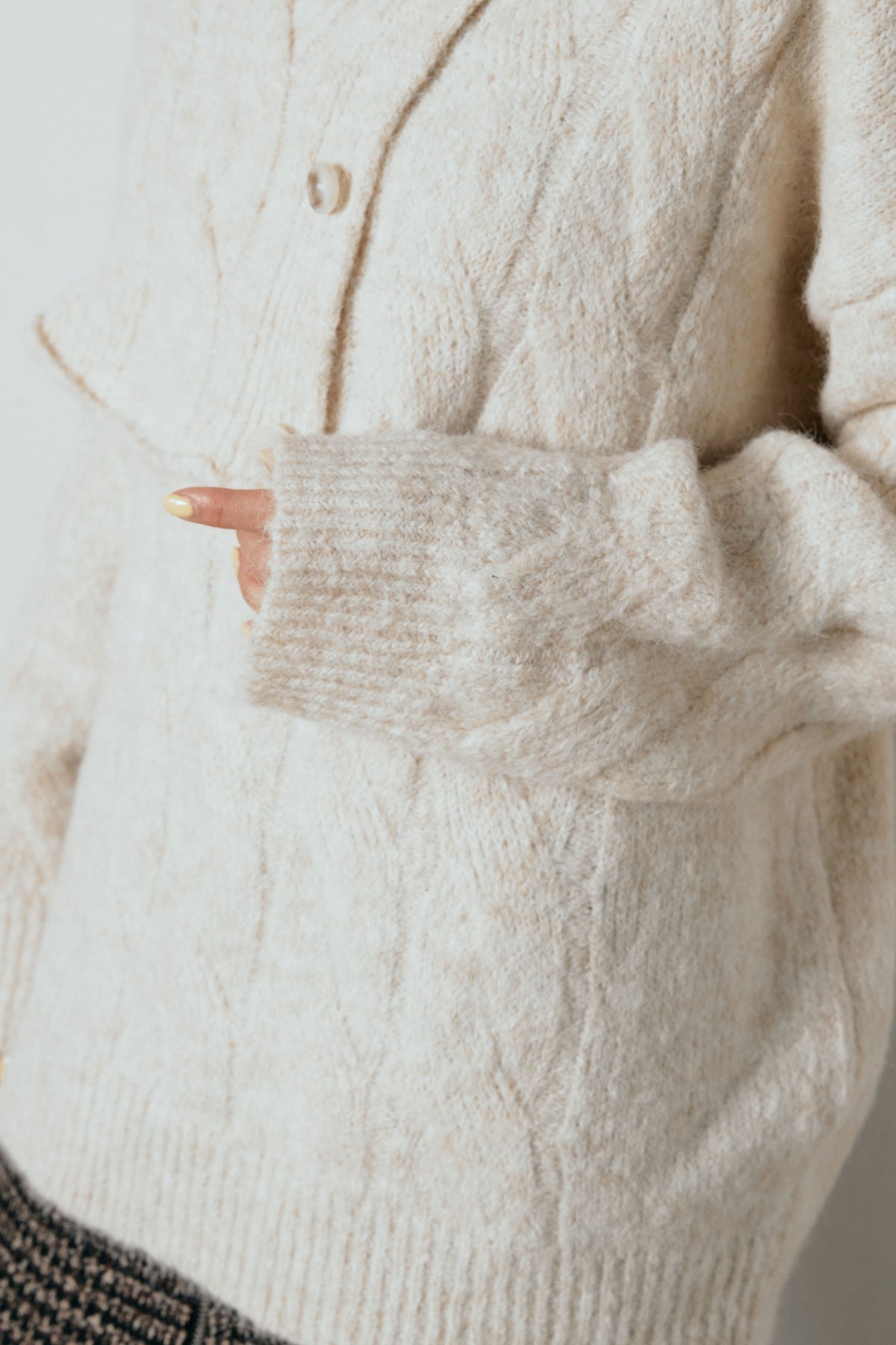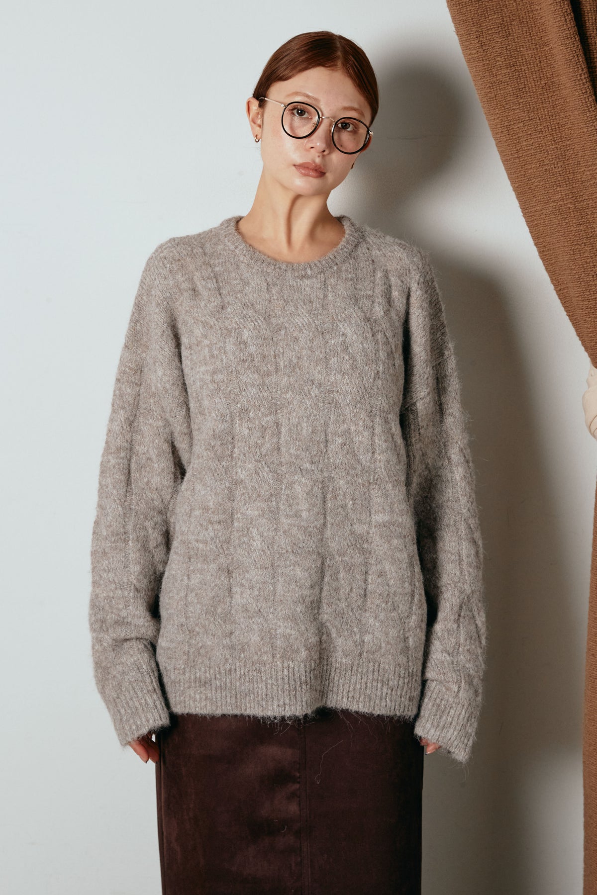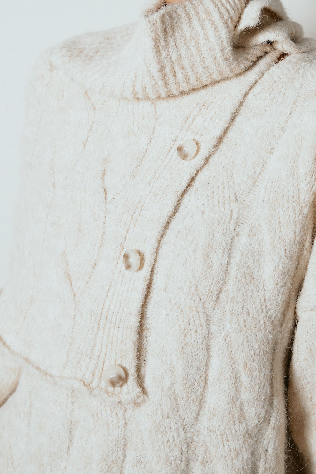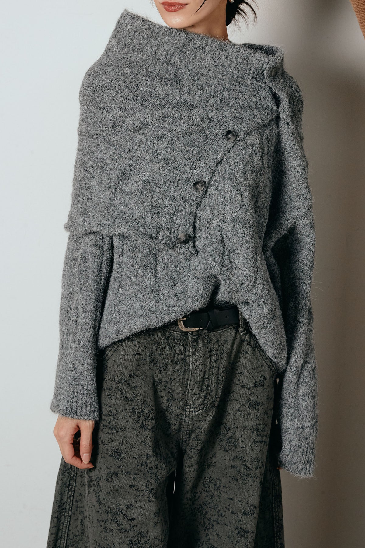立体的なケーブル編みにケープ風のアクセントを重ねたニットトップス。首元のボタンディテールが程よい存在感を出し、ラフに着るだけでニュアンスのあるバランスに。ゆとりのあるシルエットが抜け感を生み、スカートにもパンツにも合わせやすい一枚です。優しい風合いがコーデをまろやかにまとめ、日常に取り入れやすいアイテム。