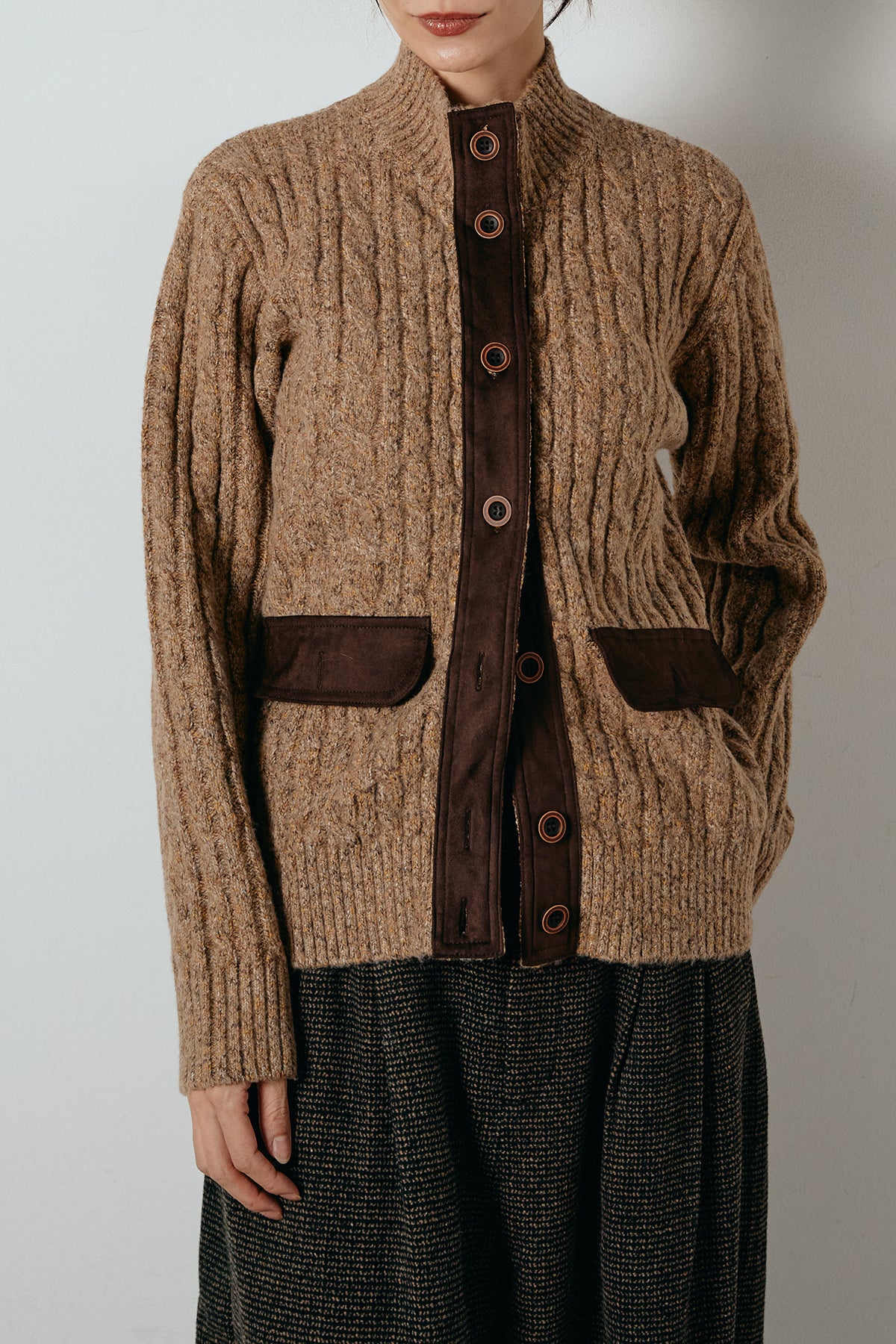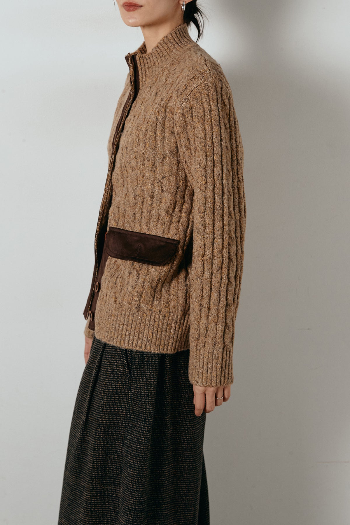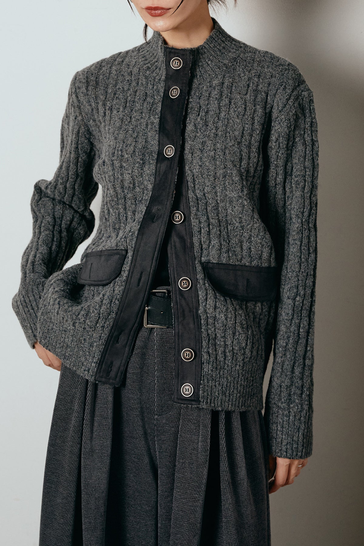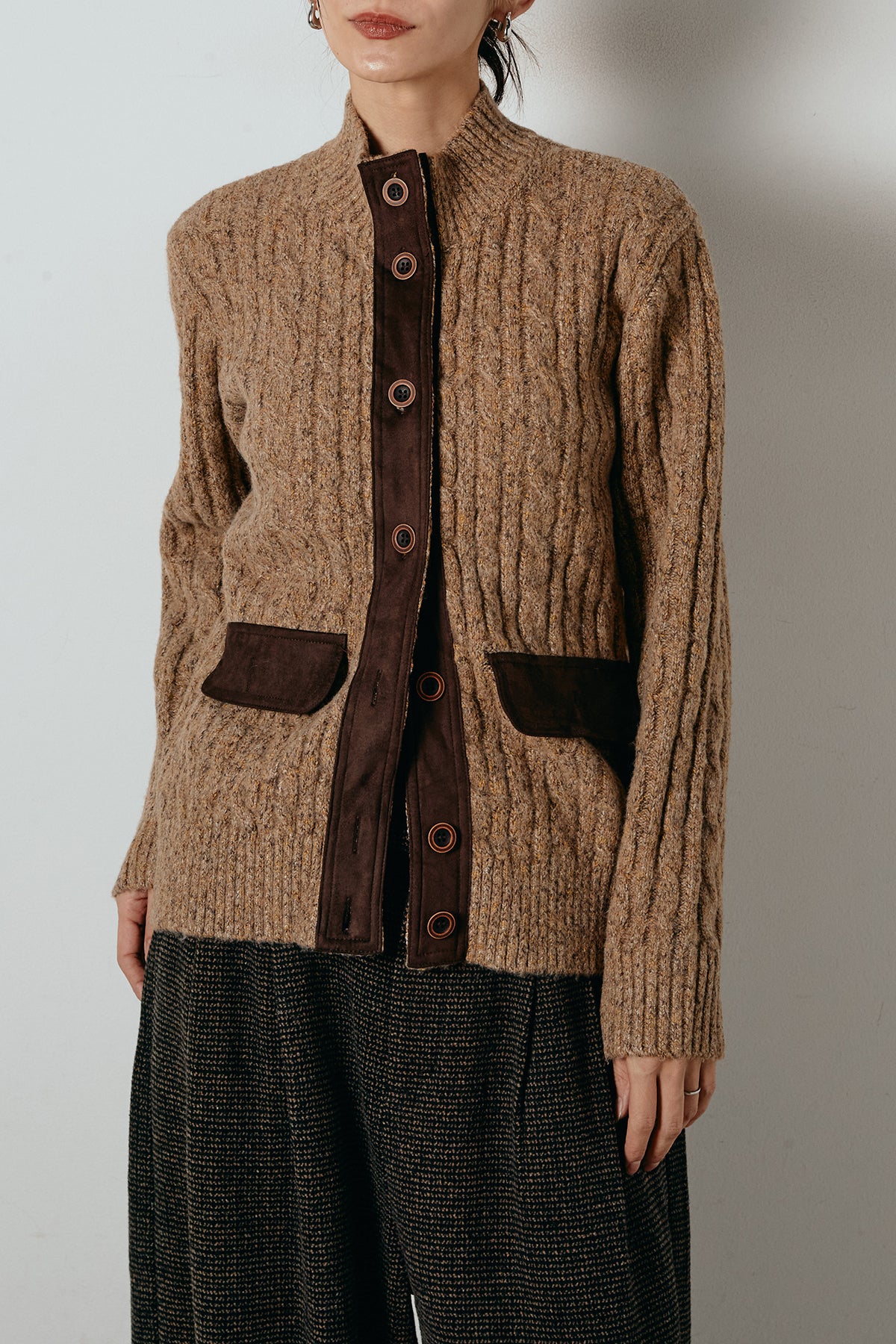 落ち着いたムードの中にアクセントを効かせたボトルネックケーブルカーディガン。縦に流れる編み柄がすっきりと見せつつ、前立てとポケットの異素材切り替えが表情をプラス。ボタンを留めればトップス風にも着られるデザインで、羽織りとしても一枚着としても活躍。カジュアルからきれいめまで幅広く馴染み、シンプルなスタイルにも奥行きを与える一枚です。