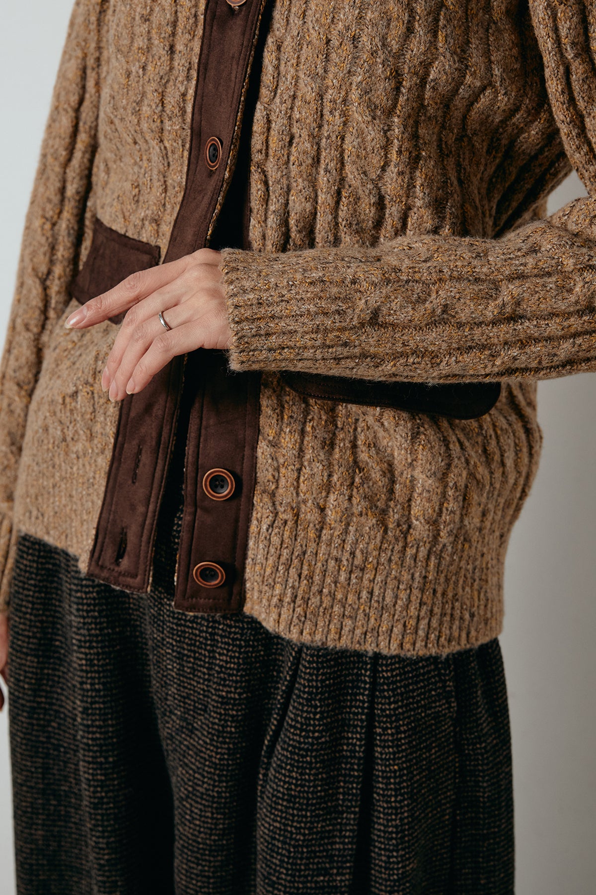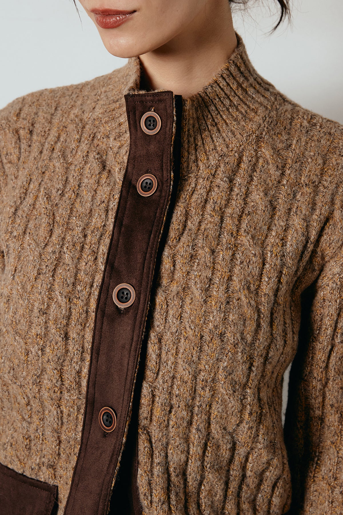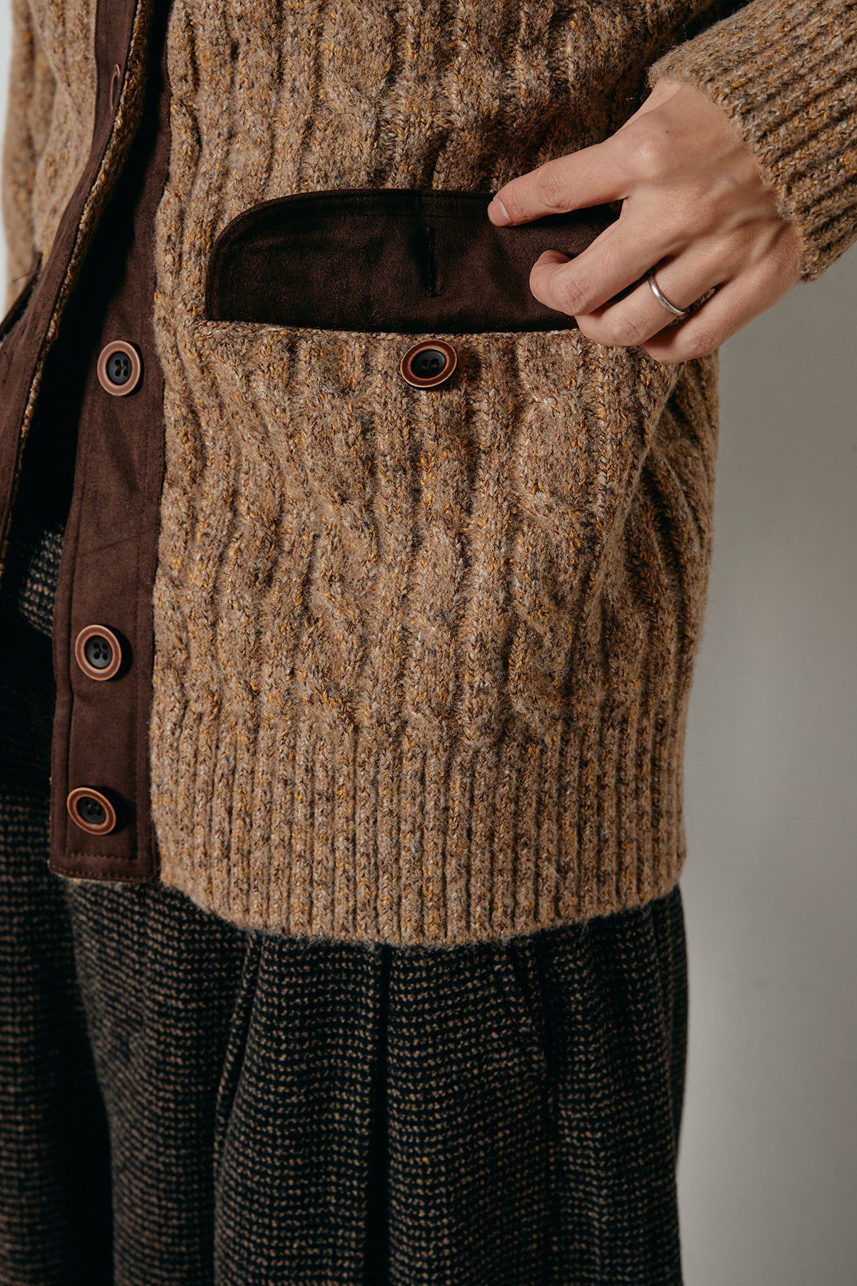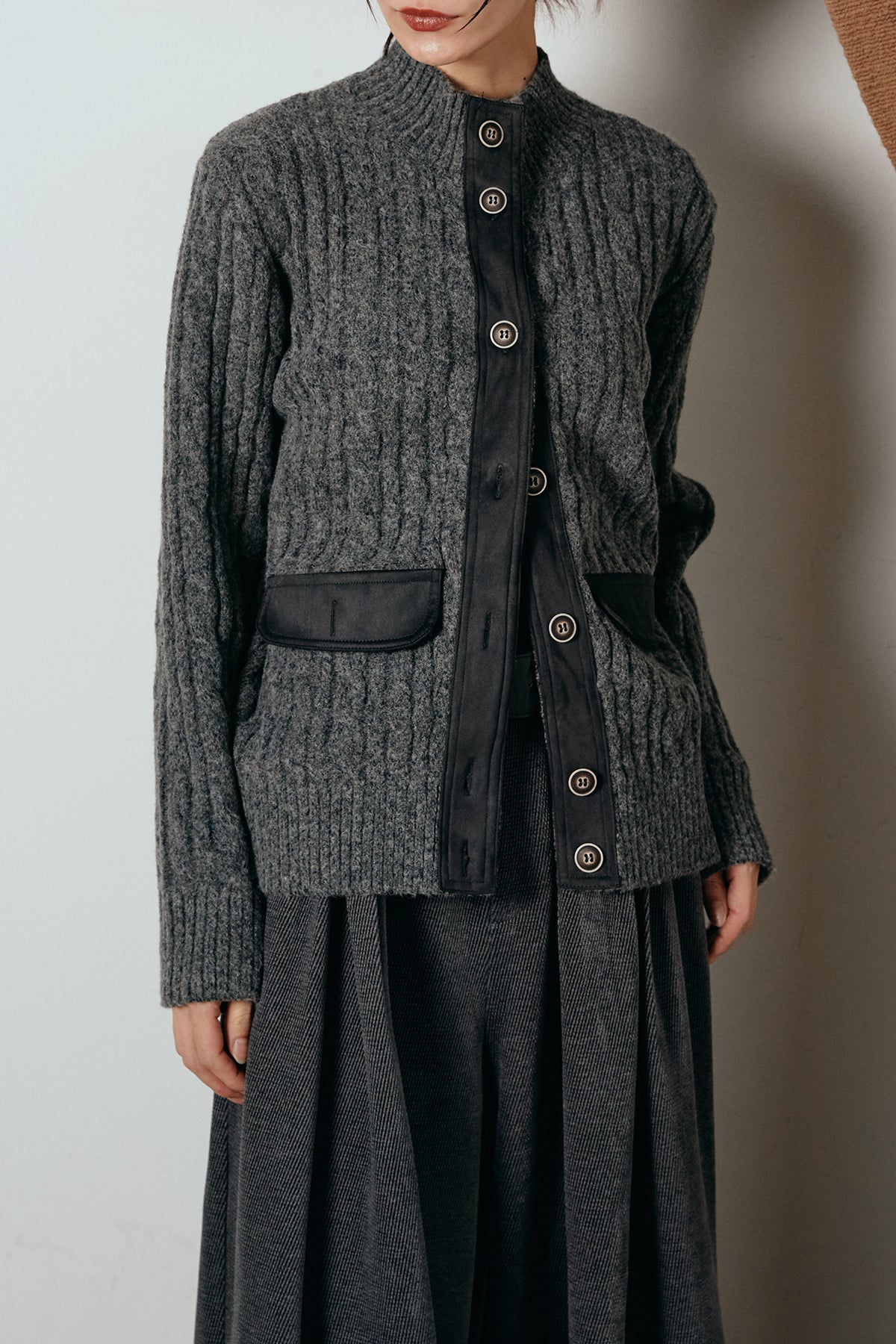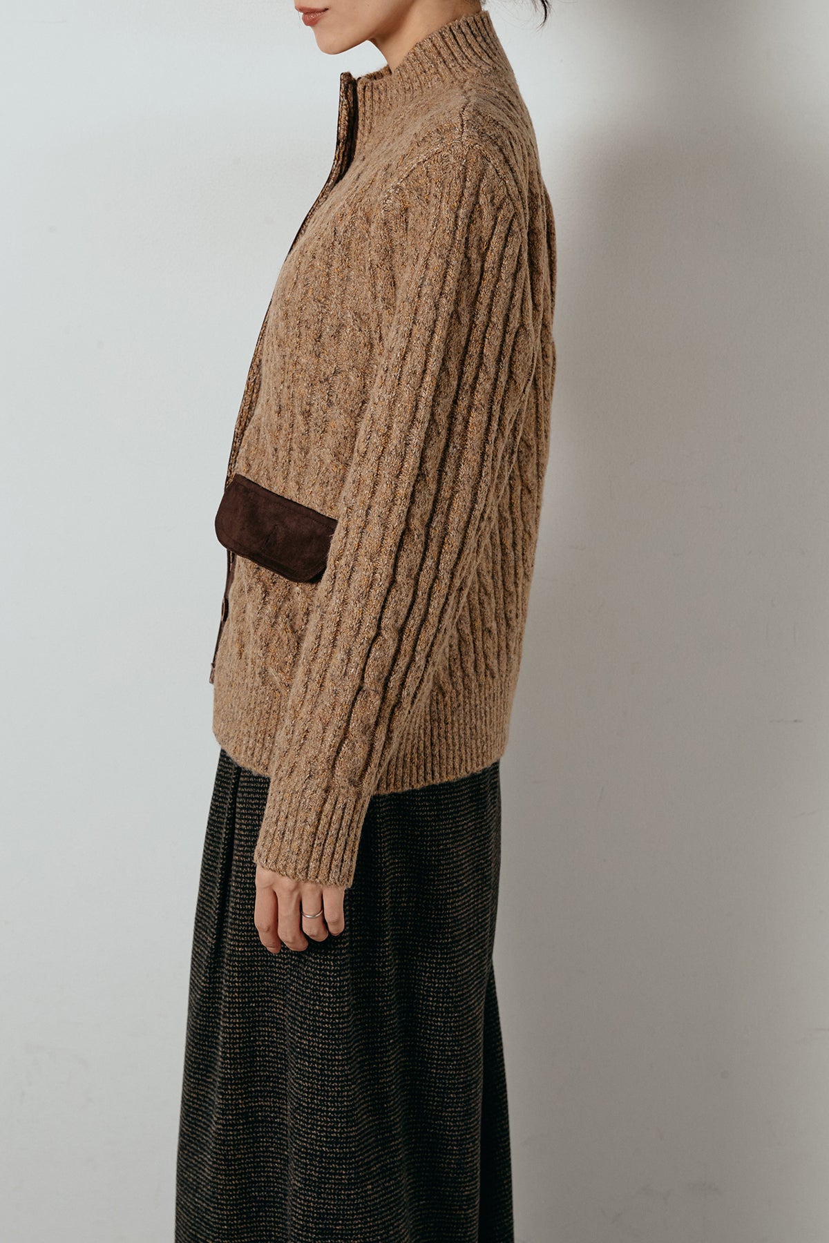 落ち着いたムードの中にアクセントを効かせたボトルネックケーブルカーディガン。縦に流れる編み柄がすっきりと見せつつ、前立てとポケットの異素材切り替えが表情をプラス。ボタンを留めればトップス風にも着られるデザインで、羽織りとしても一枚着としても活躍。カジュアルからきれいめまで幅広く馴染み、シンプルなスタイルにも奥行きを与える一枚です。