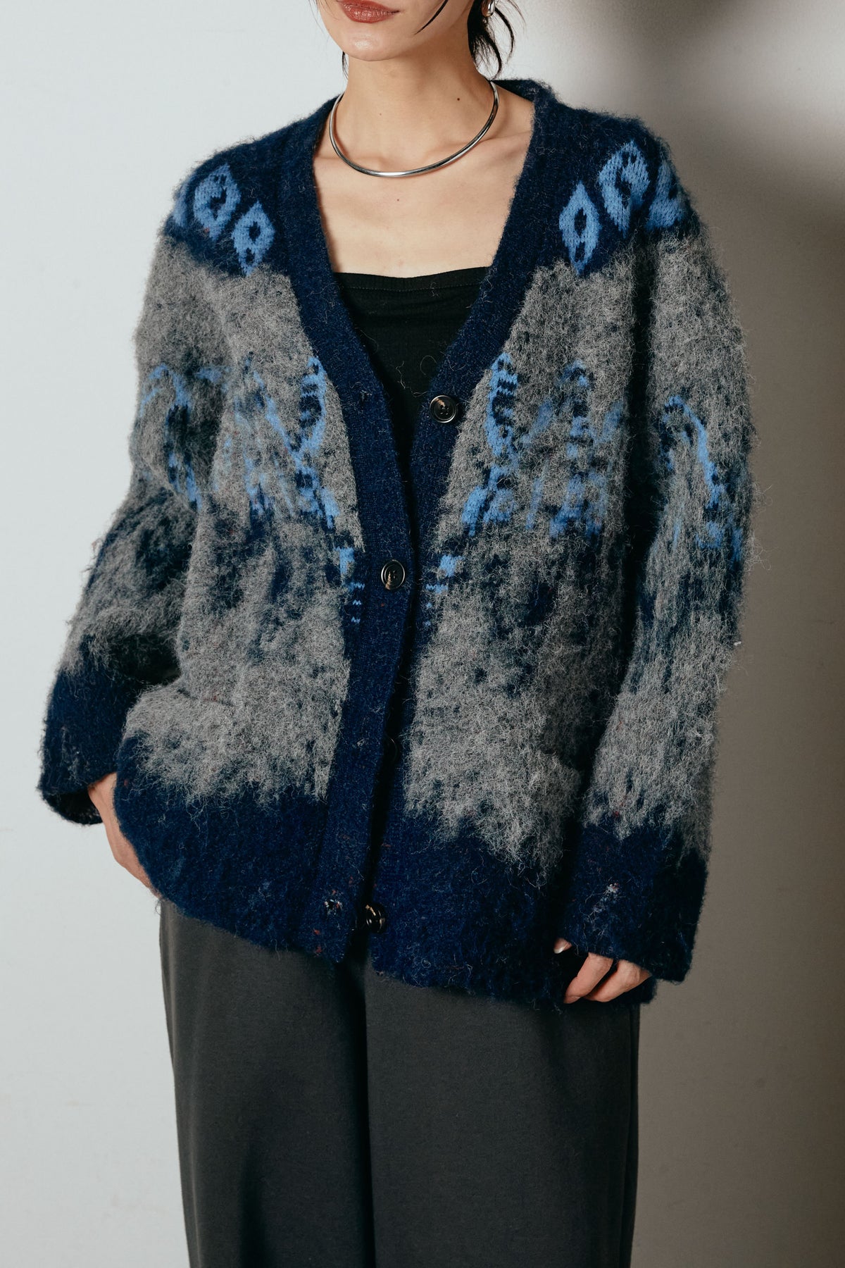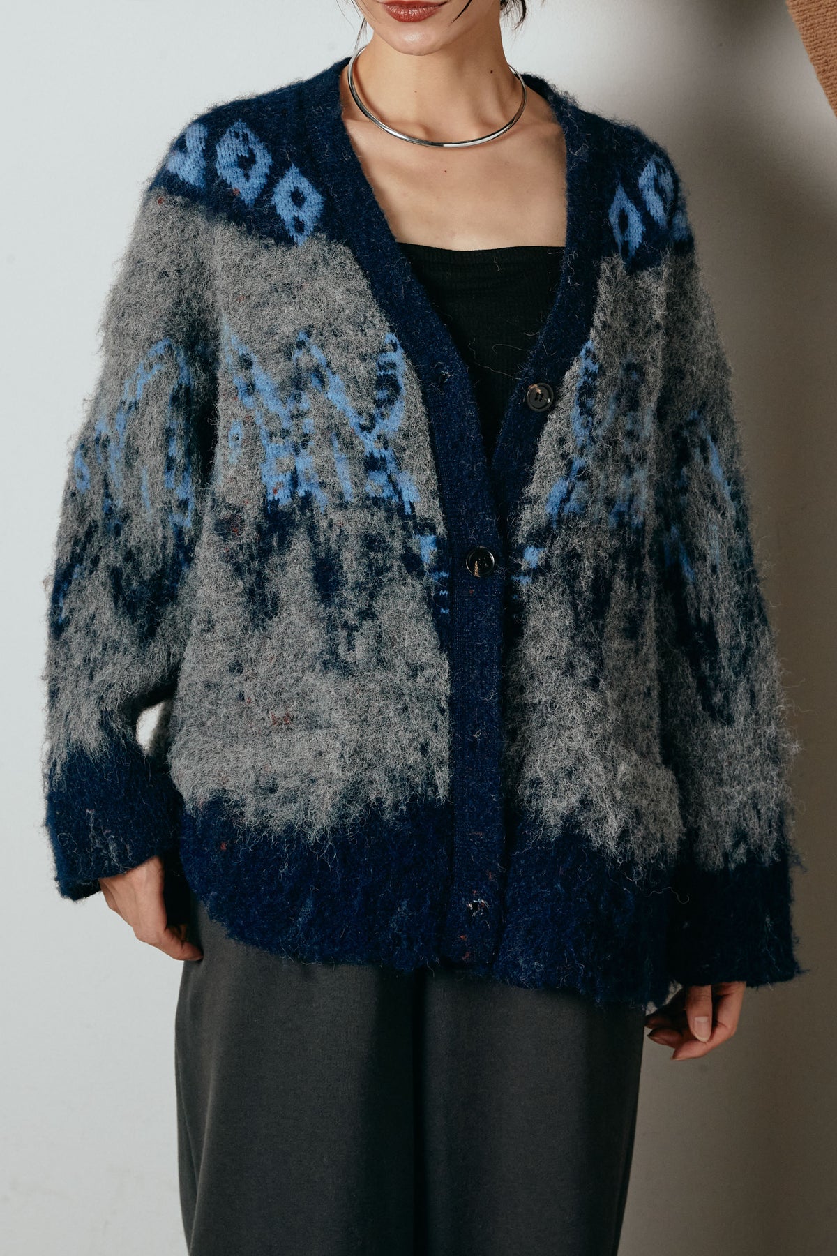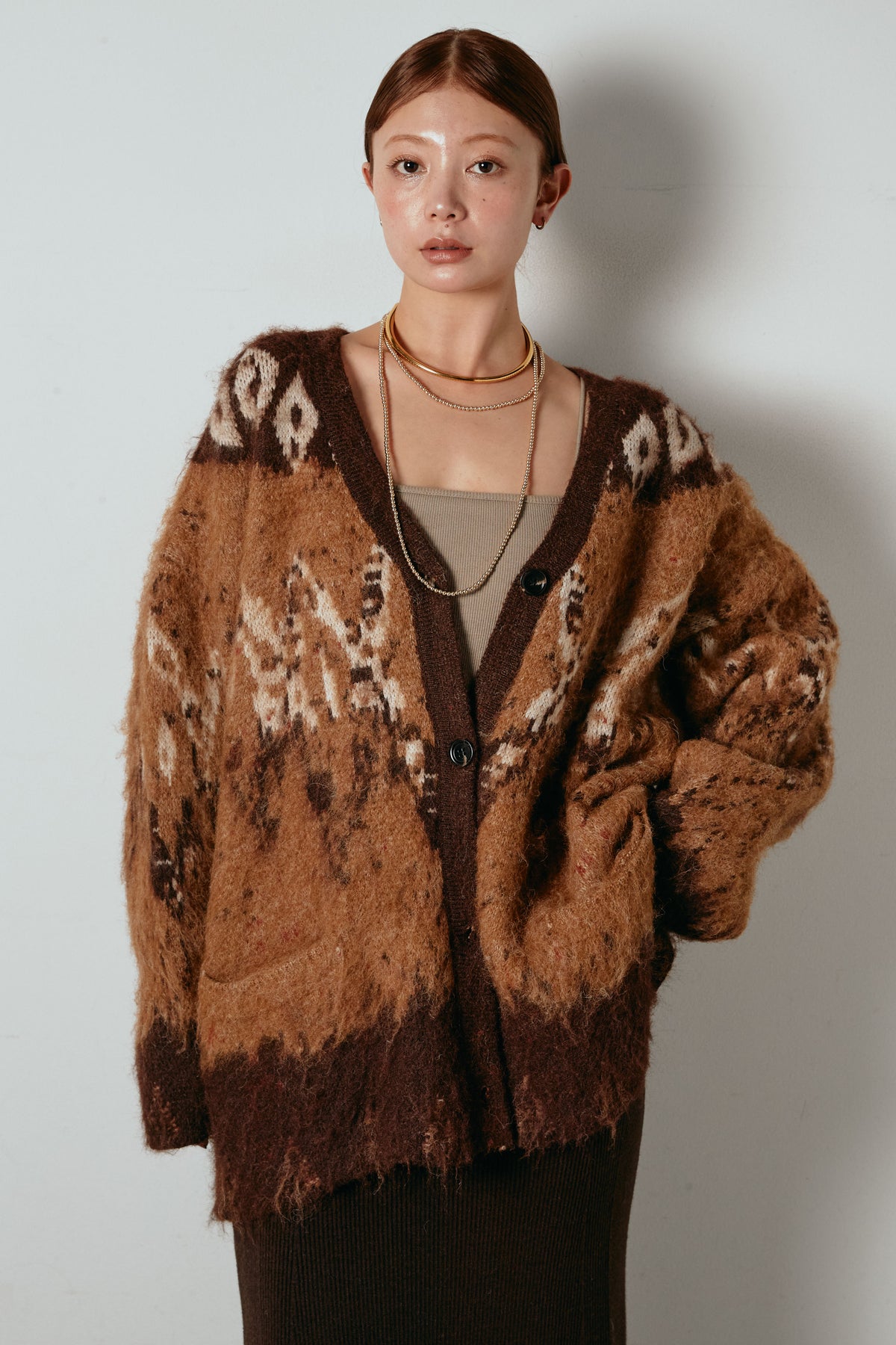 シャギーの表情が目を惹くニュアンス柄ニットカーディガン。ふわっとした質感がやわらかな印象を与えつつ、深みのある柄が大人なムードを引き立てます。ゆるめのシルエットでラフに羽織れて、ニットやワンピースとの合わせにも馴染みやすい一枚。着るだけで存在感があり、シンプルな装いに奥行きを足してくれるアイテムです。