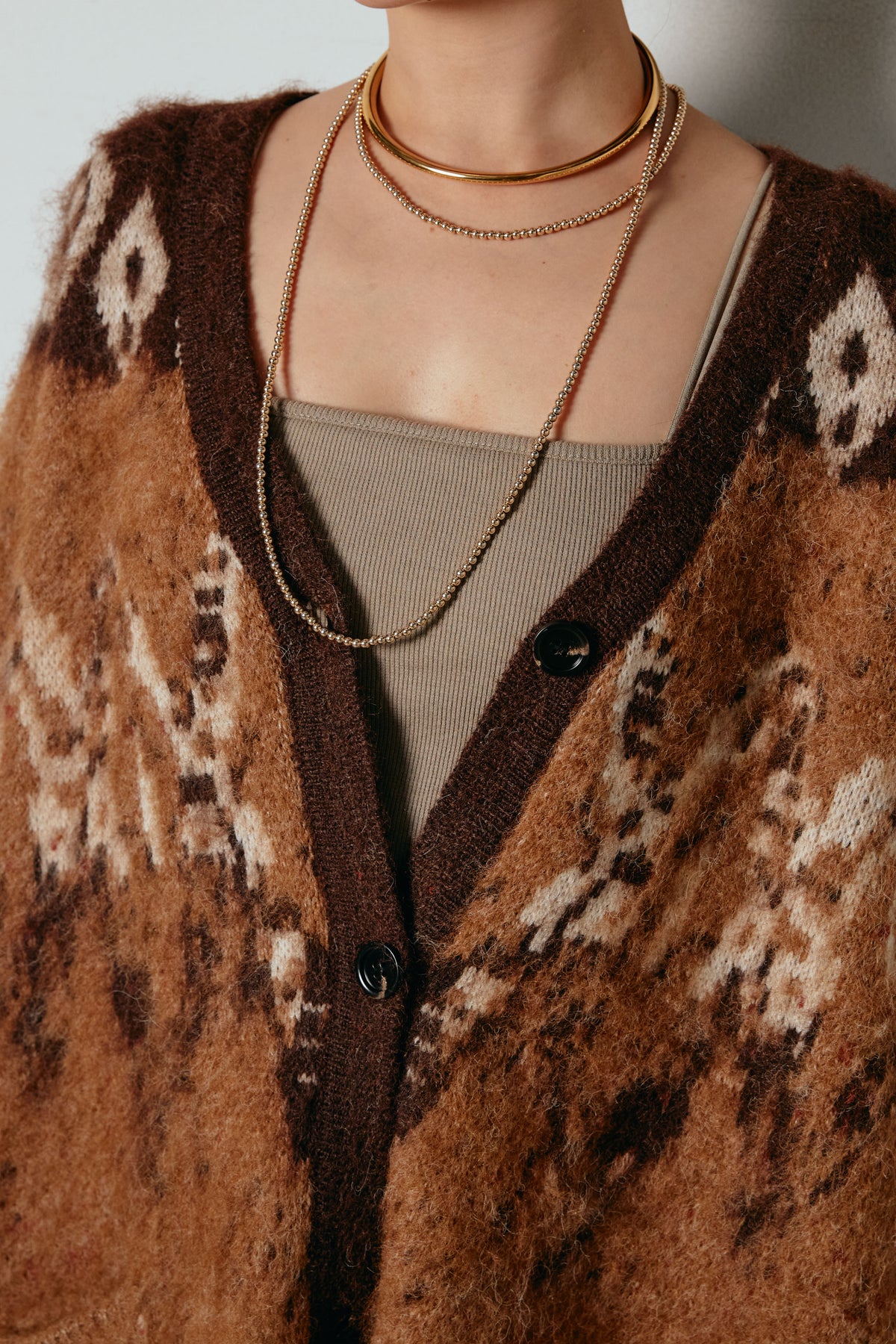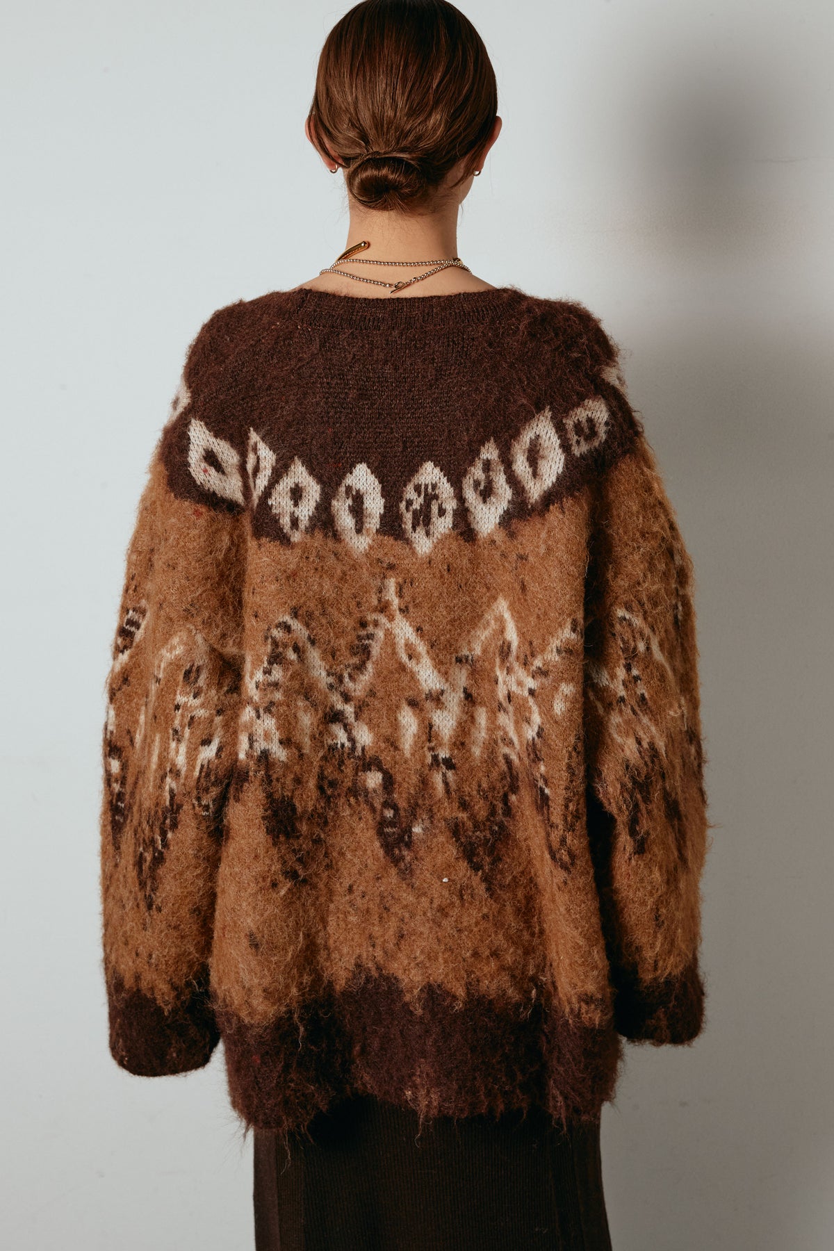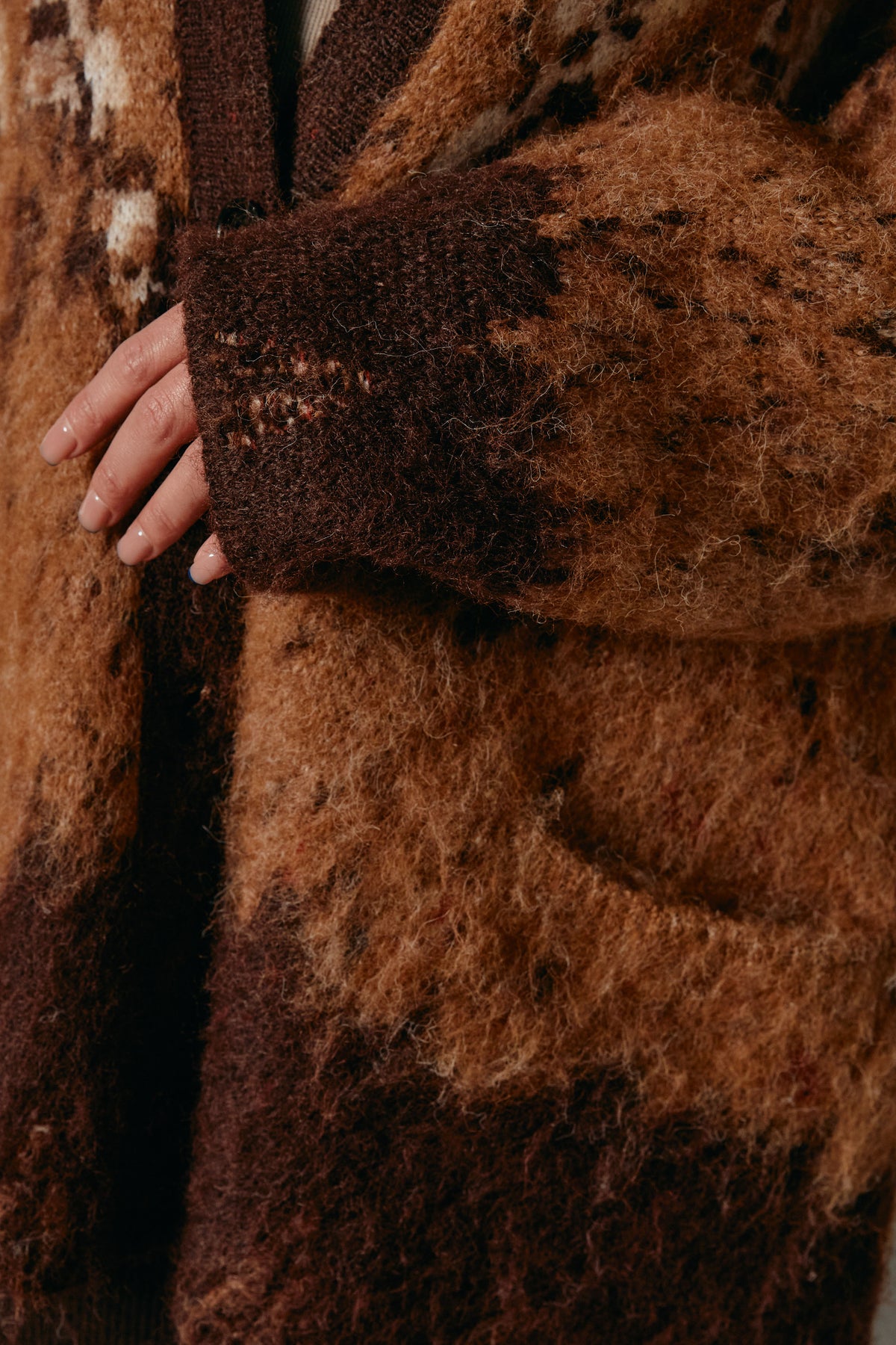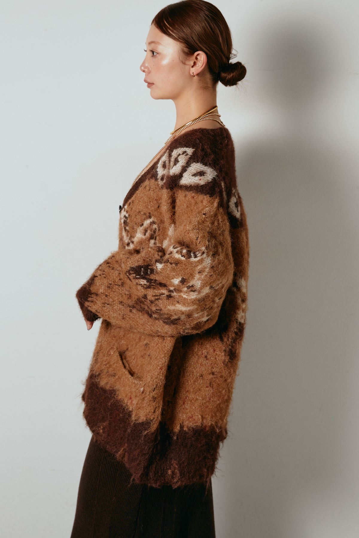 シャギーの表情が目を惹くニュアンス柄ニットカーディガン。ふわっとした質感がやわらかな印象を与えつつ、深みのある柄が大人なムードを引き立てます。ゆるめのシルエットでラフに羽織れて、ニットやワンピースとの合わせにも馴染みやすい一枚。着るだけで存在感があり、シンプルな装いに奥行きを足してくれるアイテムです。