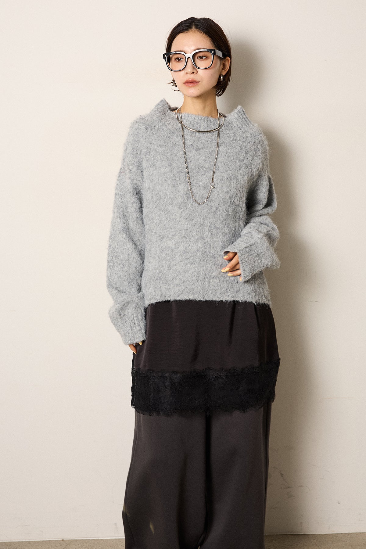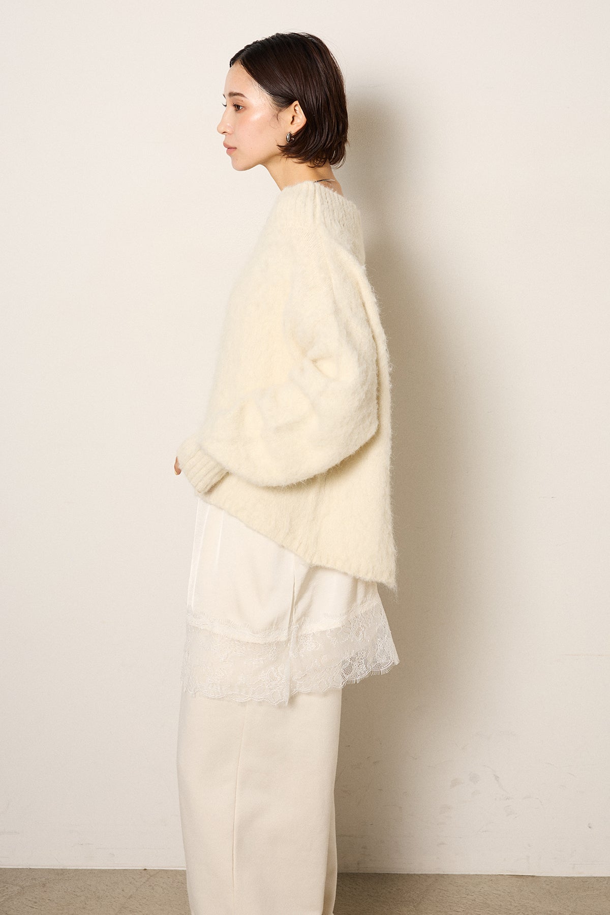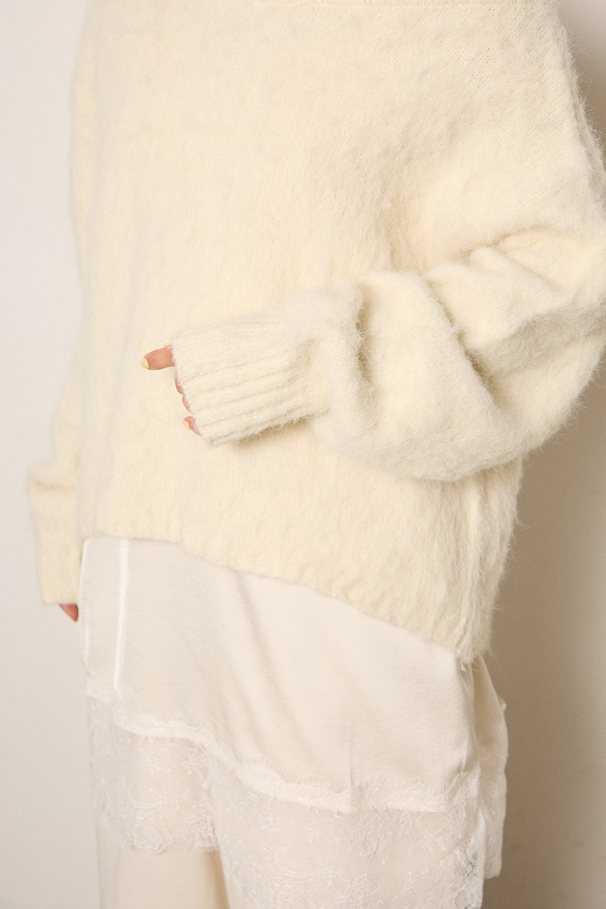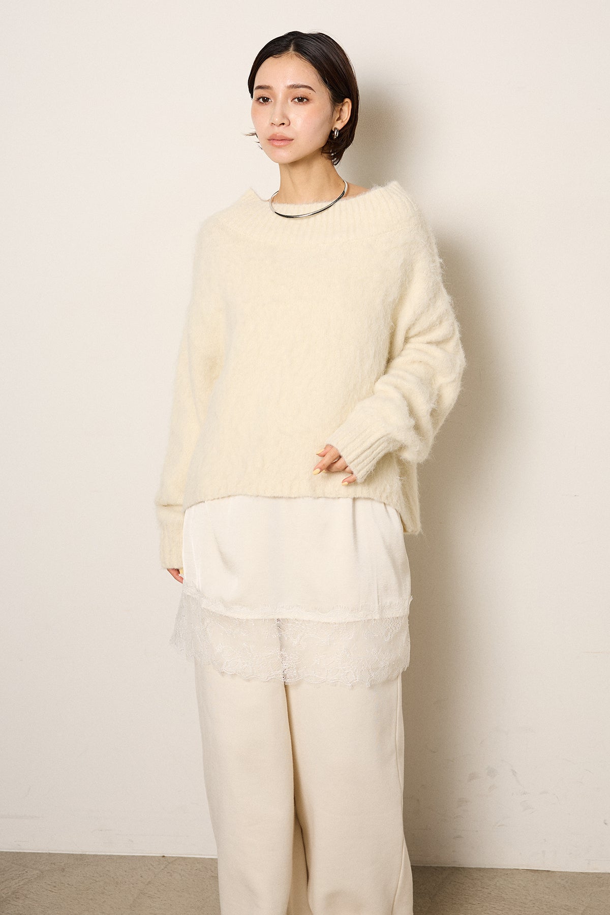 ふんわりとした風合いが魅力のアルパカタッチニット。肩のラインをゆるっと落としたオフショルシルエットが、抜け感のあるバランスをつくります。やわらかい編地が軽やかに体を包み込み、リラックスムード漂う佇まいに。ロング丈のインナーやワイドパンツとも合わせやすく、シンプルながら雰囲気のあるスタイルを楽しめる一枚です。