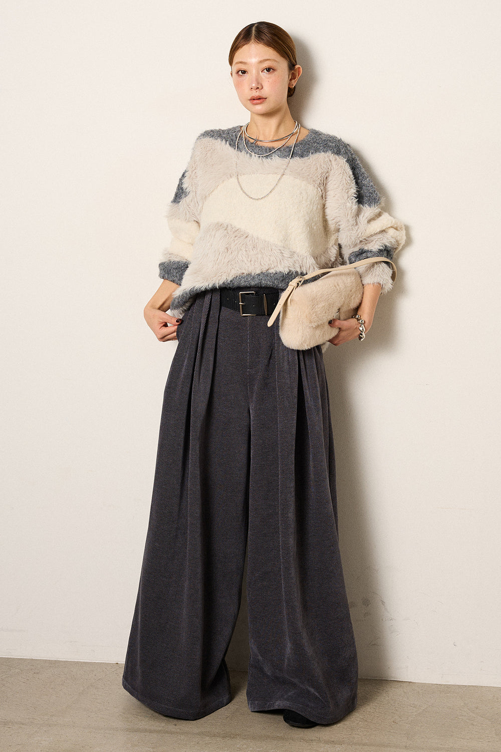 [SET]シャギークロスニットトップス+細ベルト付き起毛タックワイドパンツ(2set)