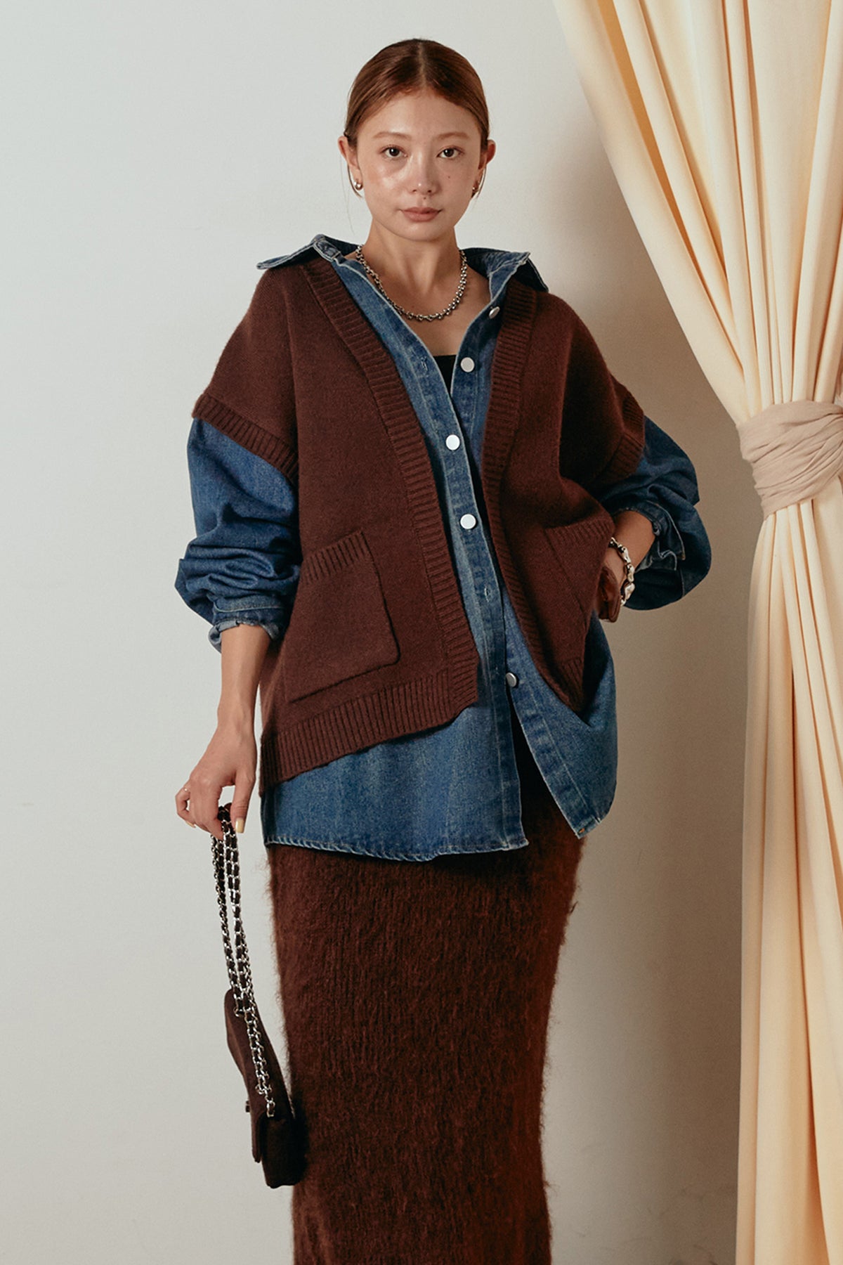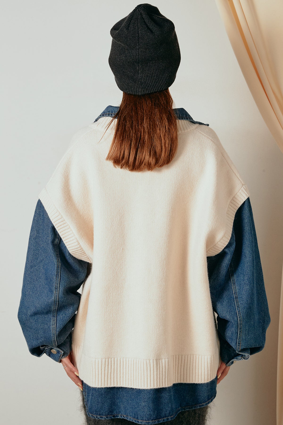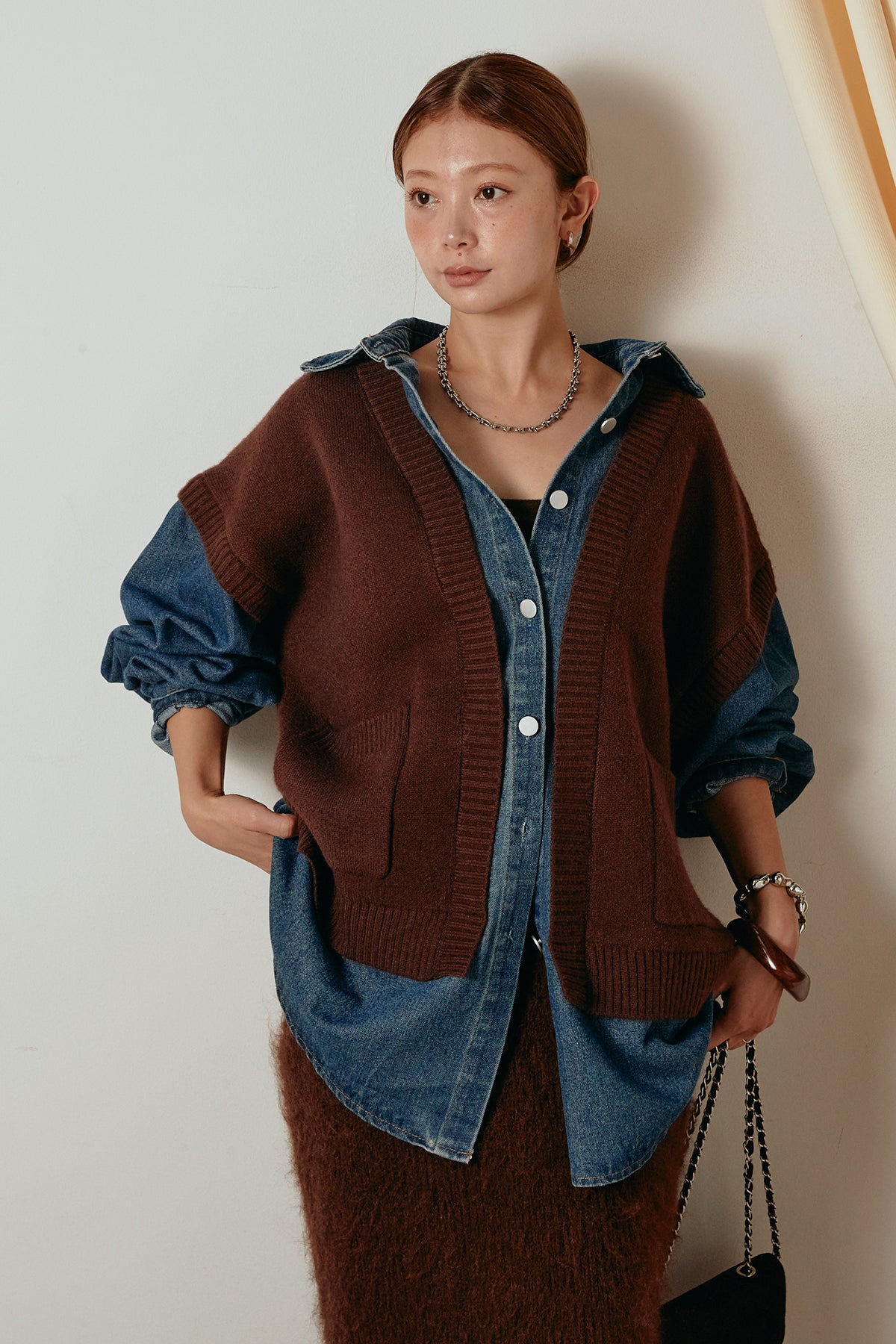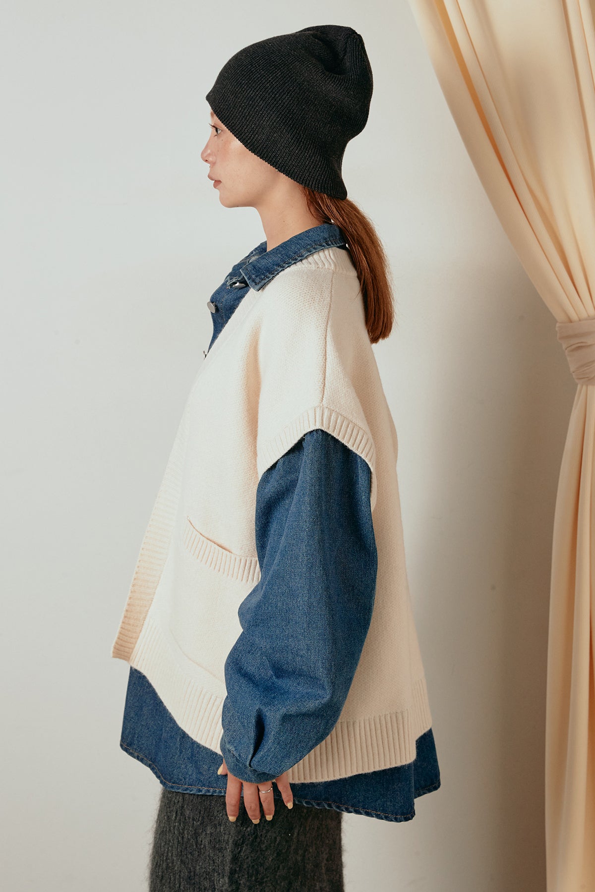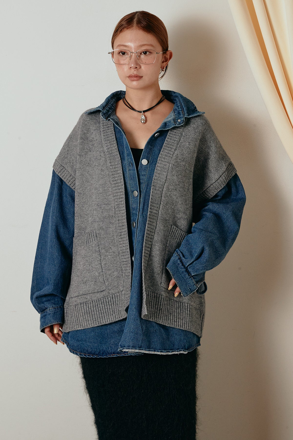 デニムシャツにニットベストを重ねたようなドッキングデザインのジャケット。異素材の組み合わせが奥行きを生み、1枚でレイヤードスタイルが完成します。カジュアルながらも程よく抜け感があり、ボタンを開けて羽織るだけでこなれた印象に。季節の変わり目にぴったりのアイテムです。