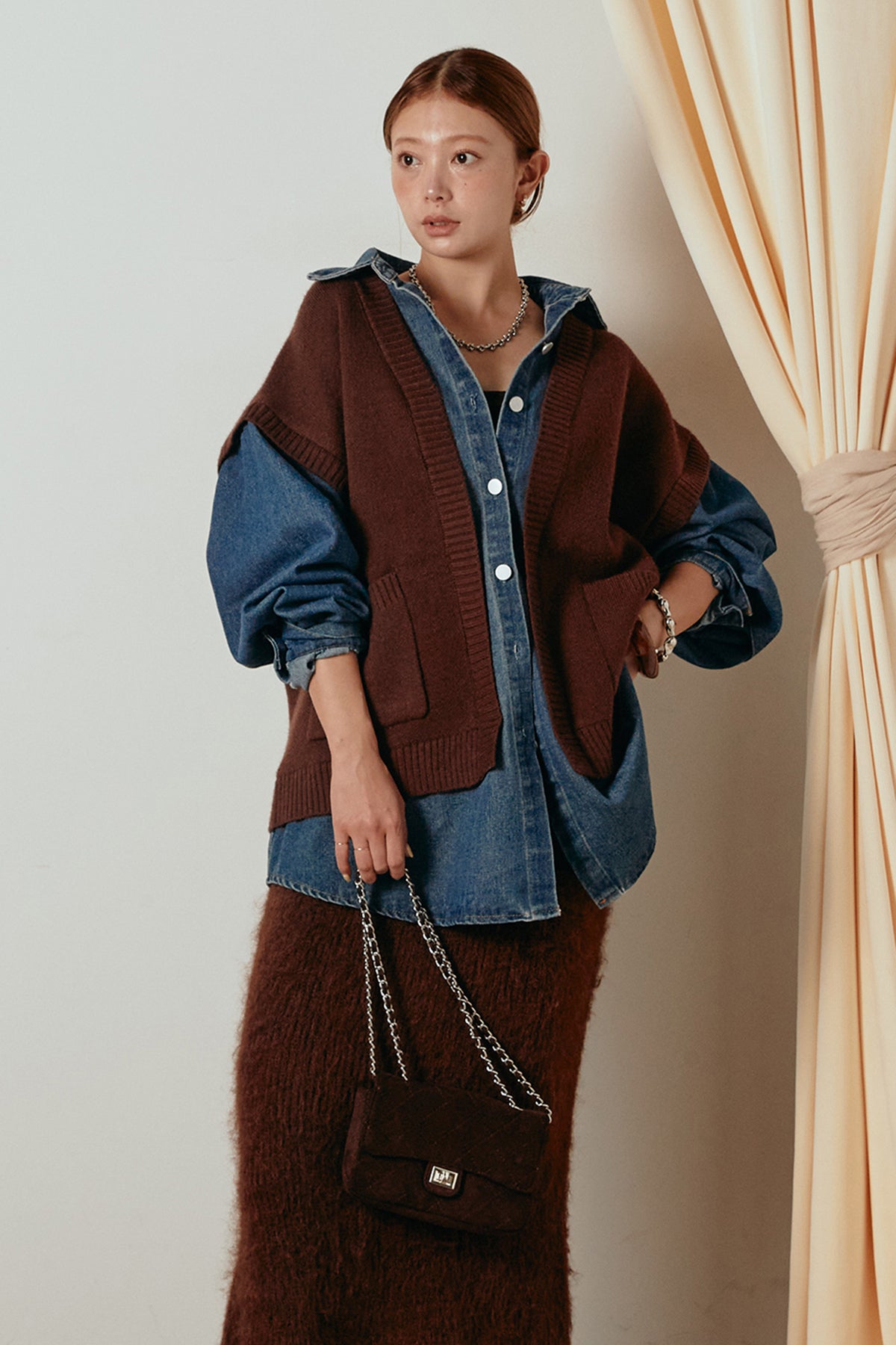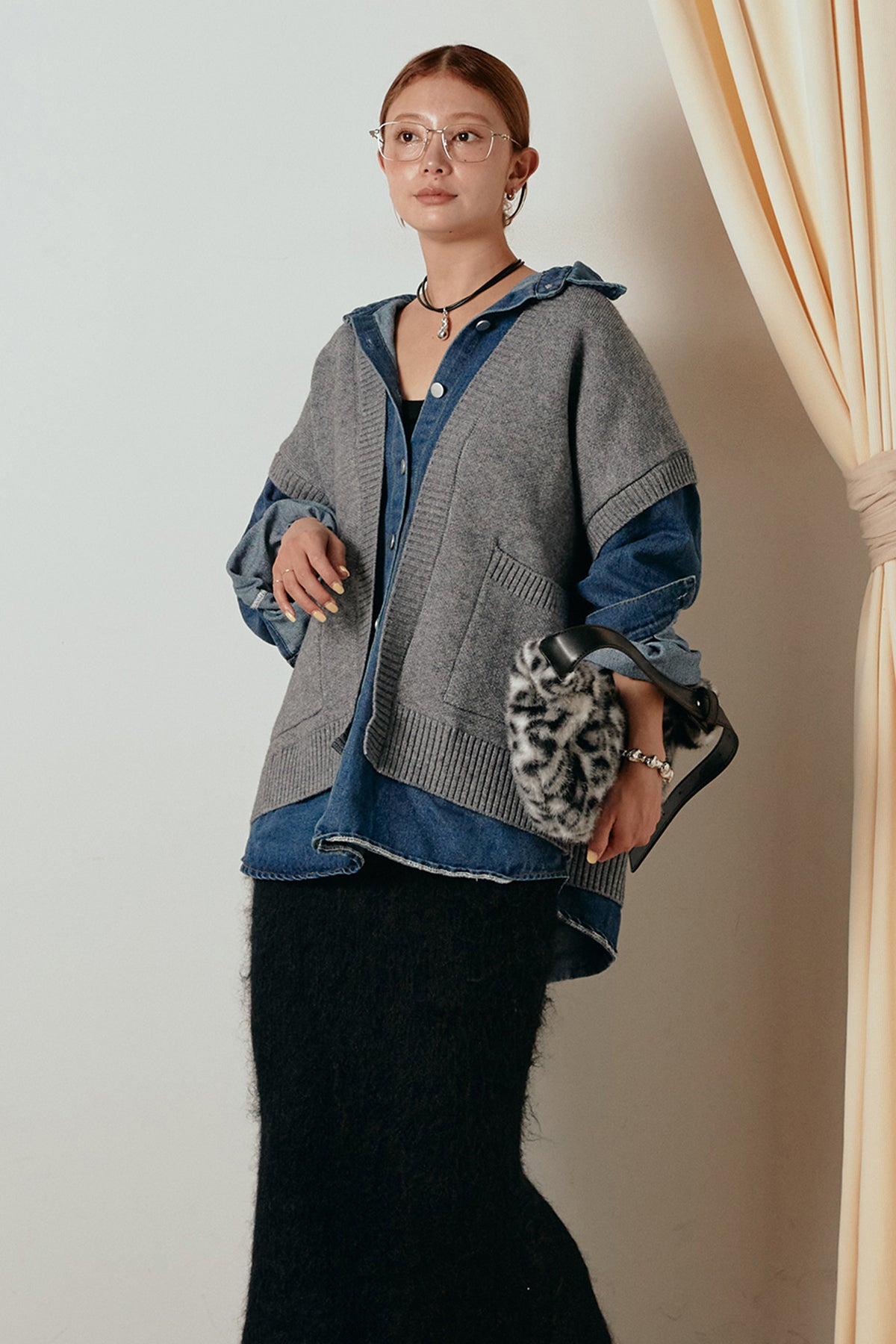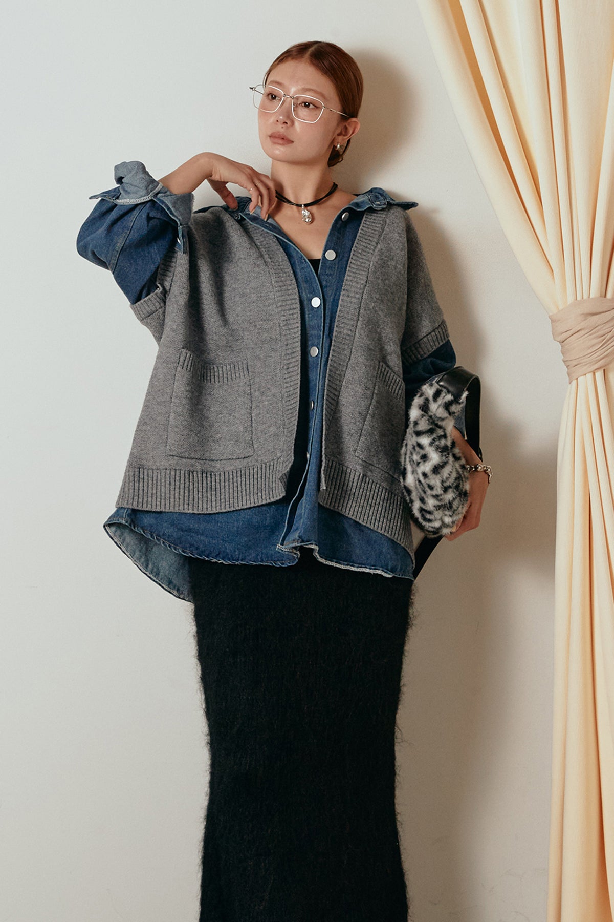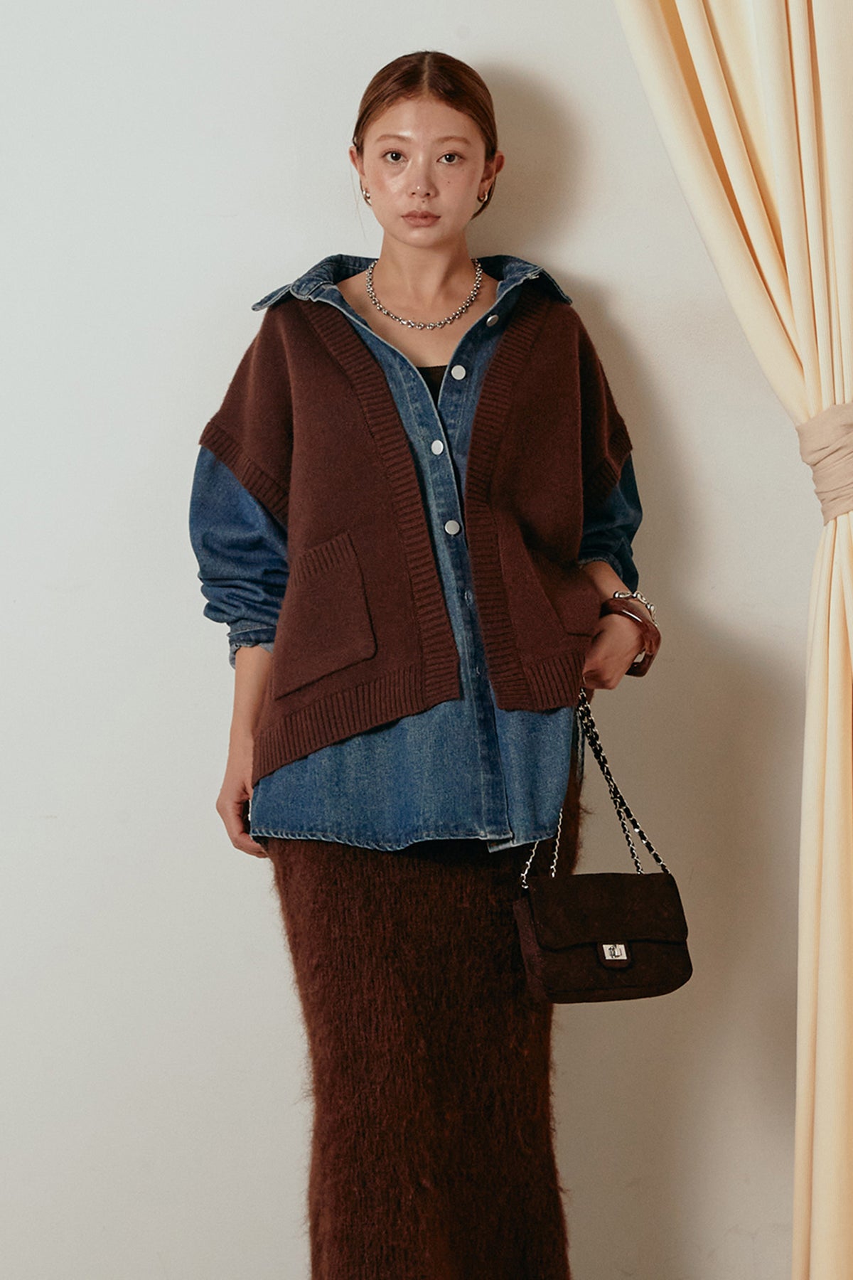 デニムシャツにニットベストを重ねたようなドッキングデザインのジャケット。異素材の組み合わせが奥行きを生み、1枚でレイヤードスタイルが完成します。カジュアルながらも程よく抜け感があり、ボタンを開けて羽織るだけでこなれた印象に。季節の変わり目にぴったりのアイテムです。