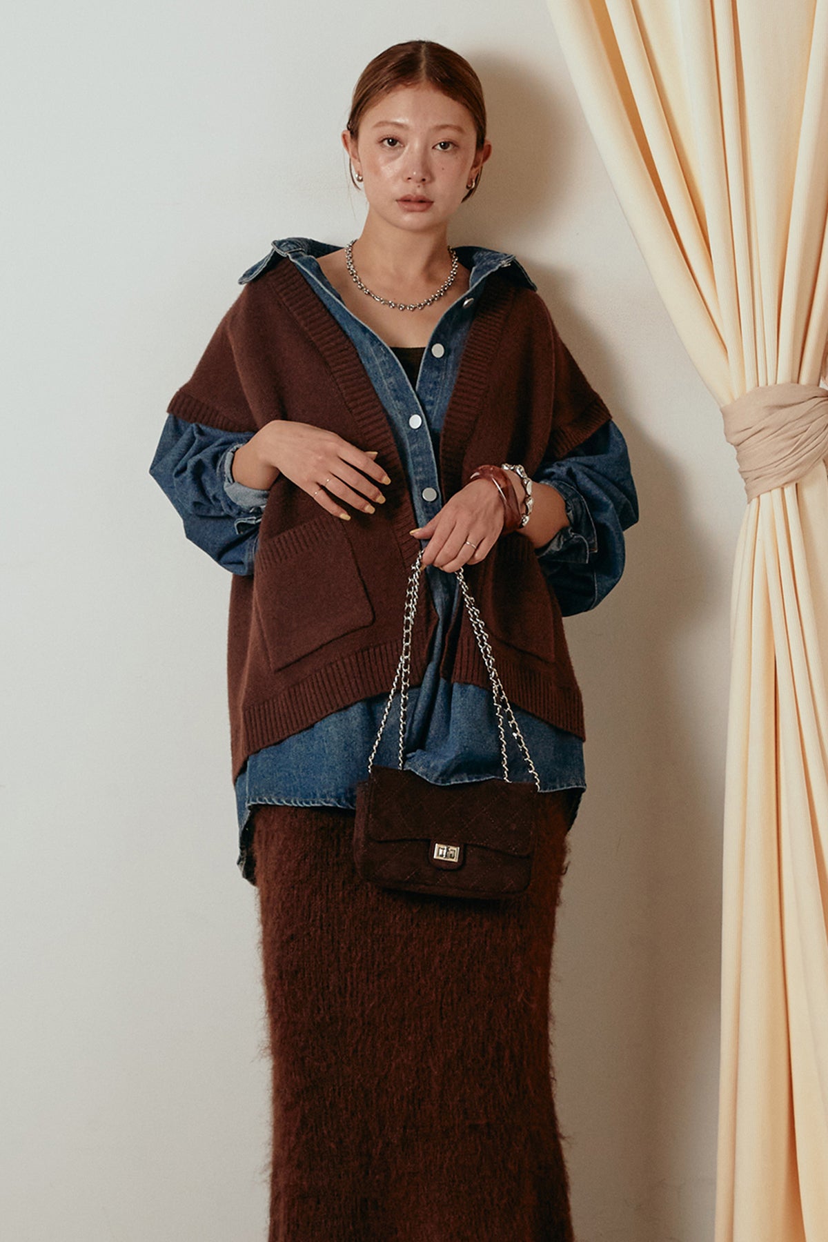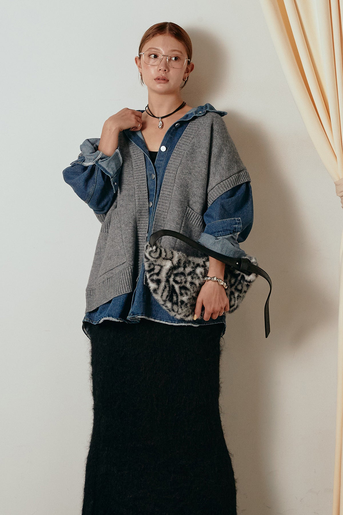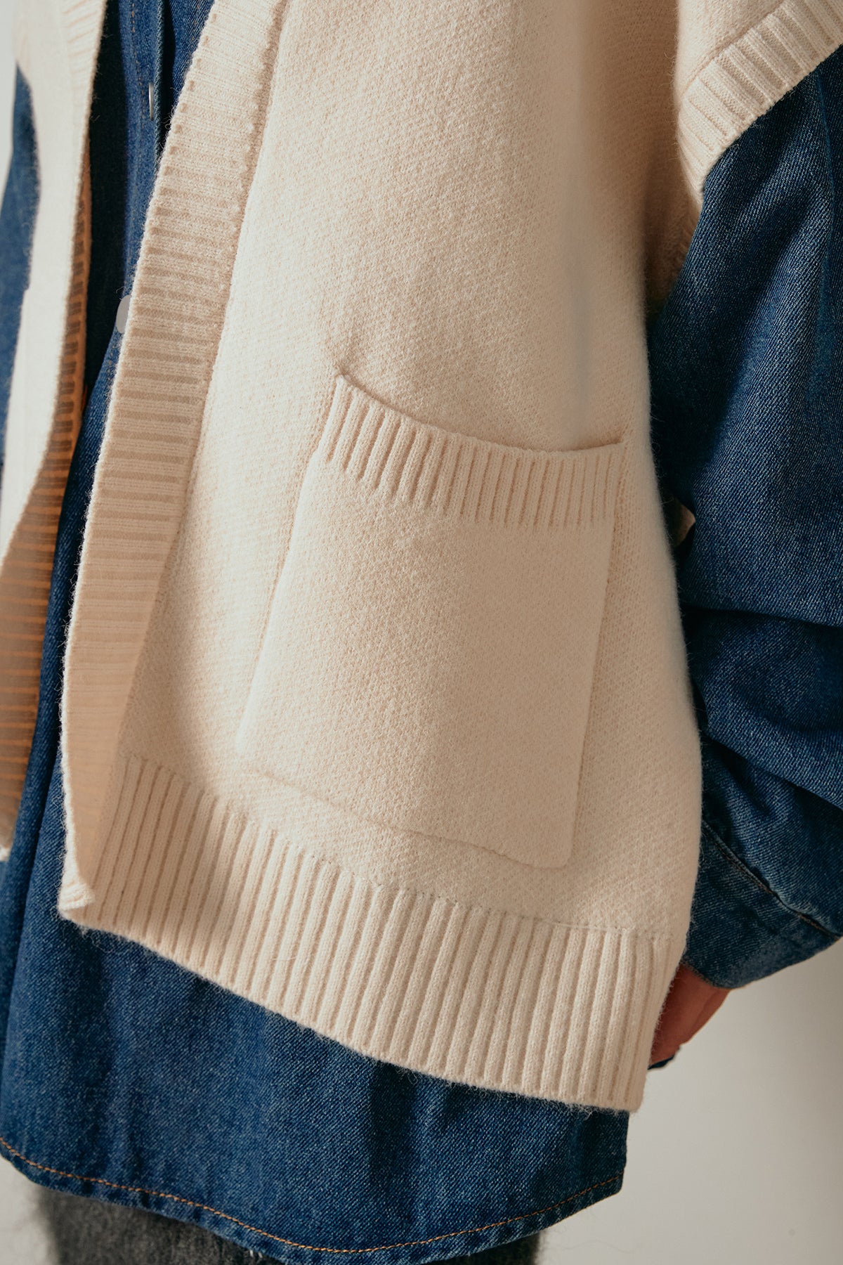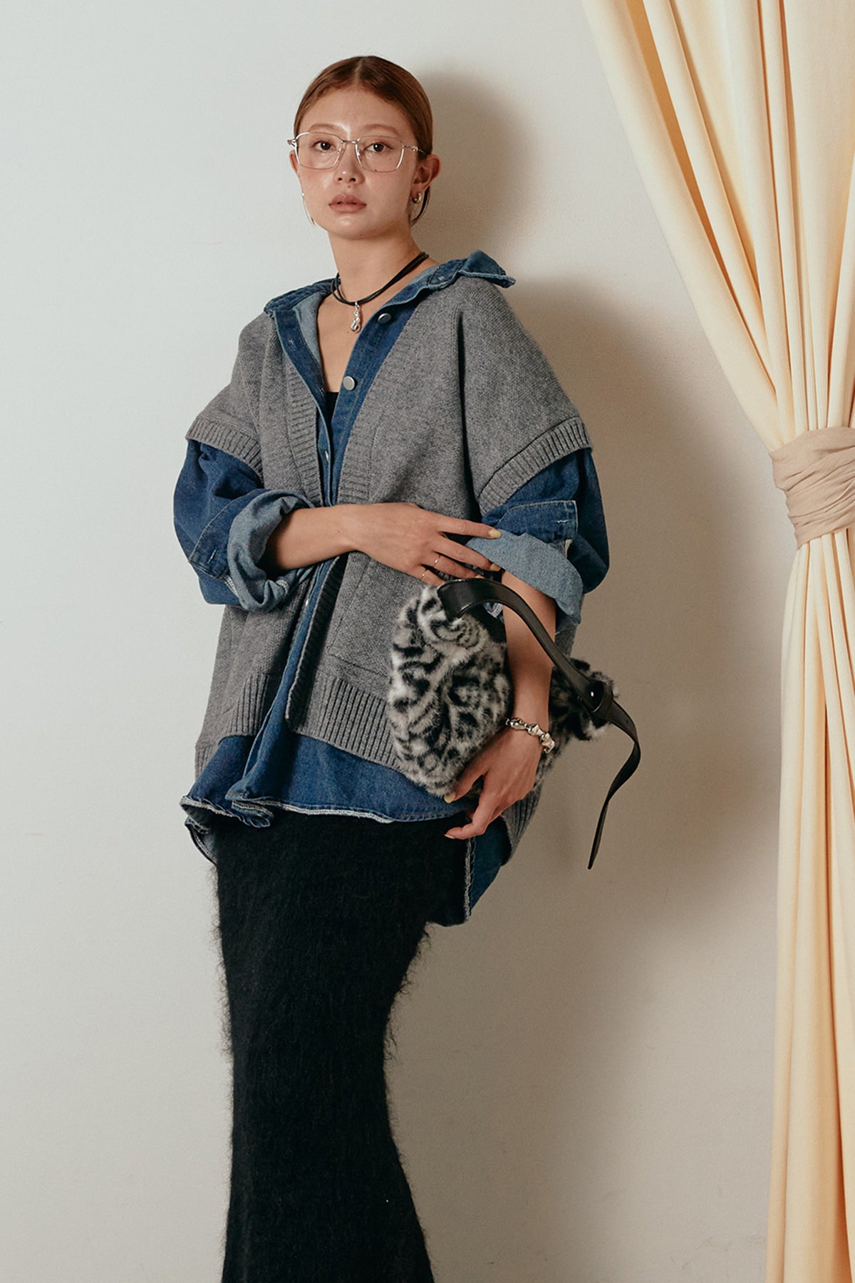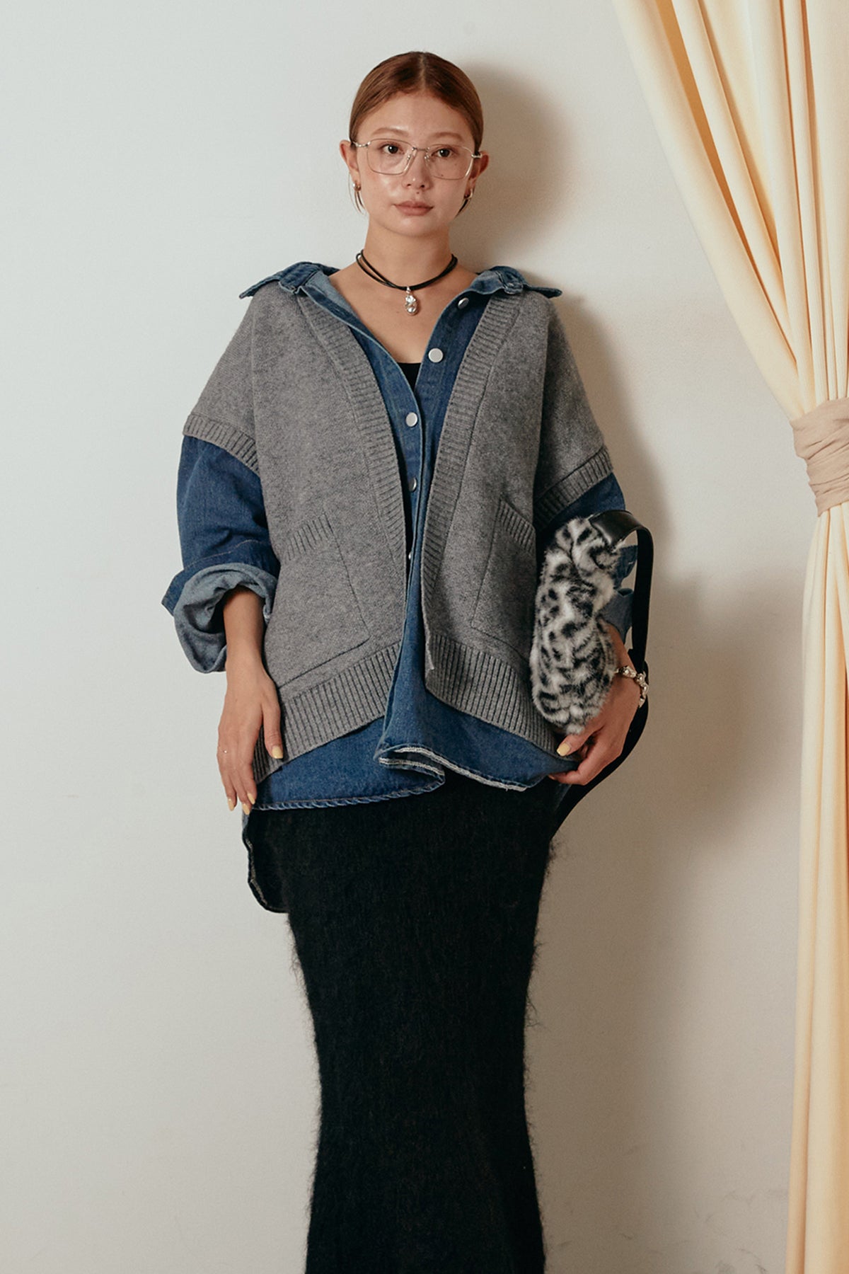 デニムシャツにニットベストを重ねたようなドッキングデザインのジャケット。異素材の組み合わせが奥行きを生み、1枚でレイヤードスタイルが完成します。カジュアルながらも程よく抜け感があり、ボタンを開けて羽織るだけでこなれた印象に。季節の変わり目にぴったりのアイテムです。